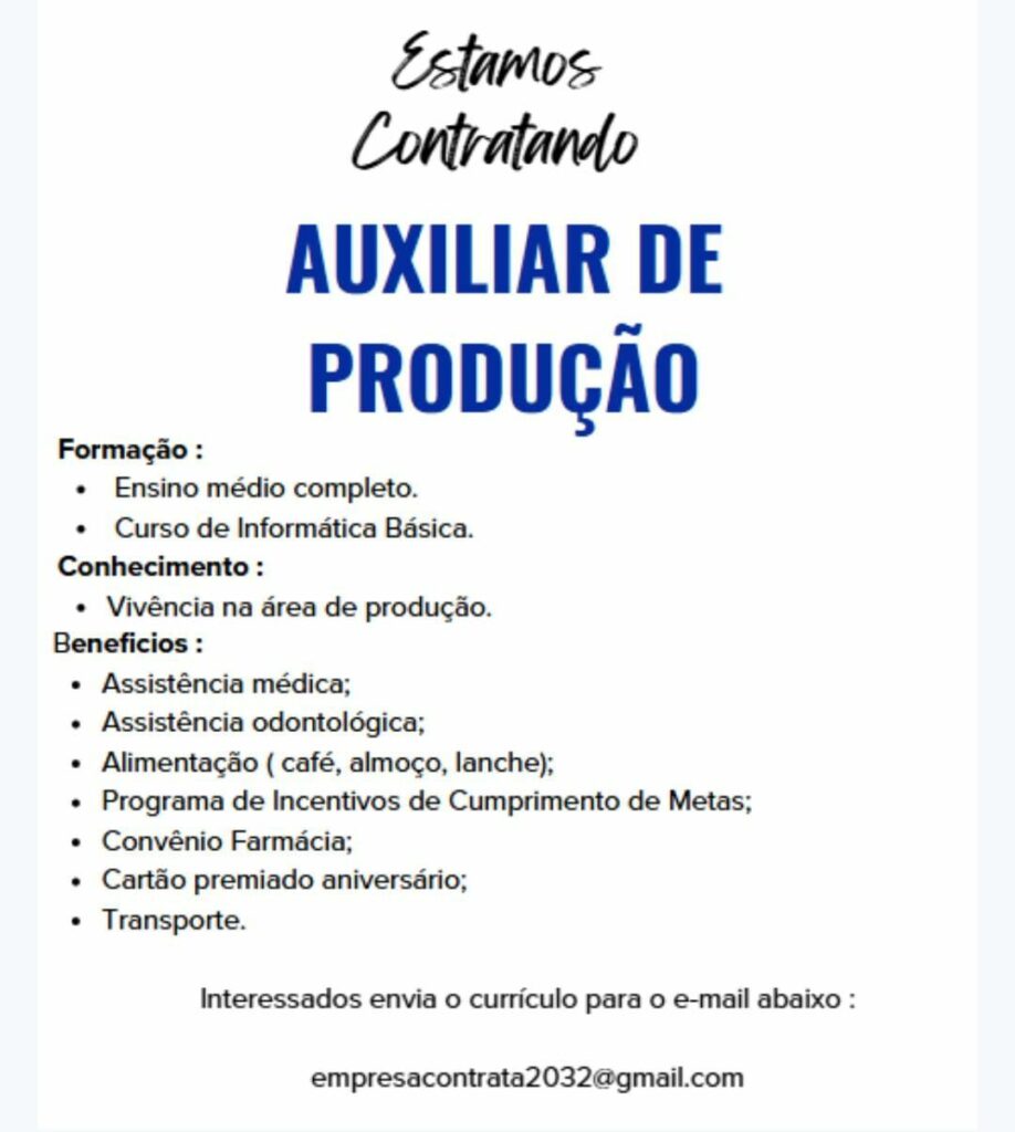 Empresa está selecionando Auxiliar de produção; Envie seu currículo!