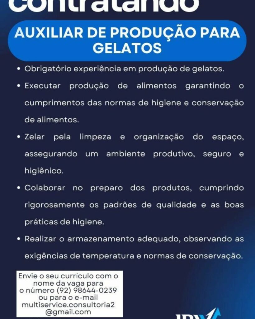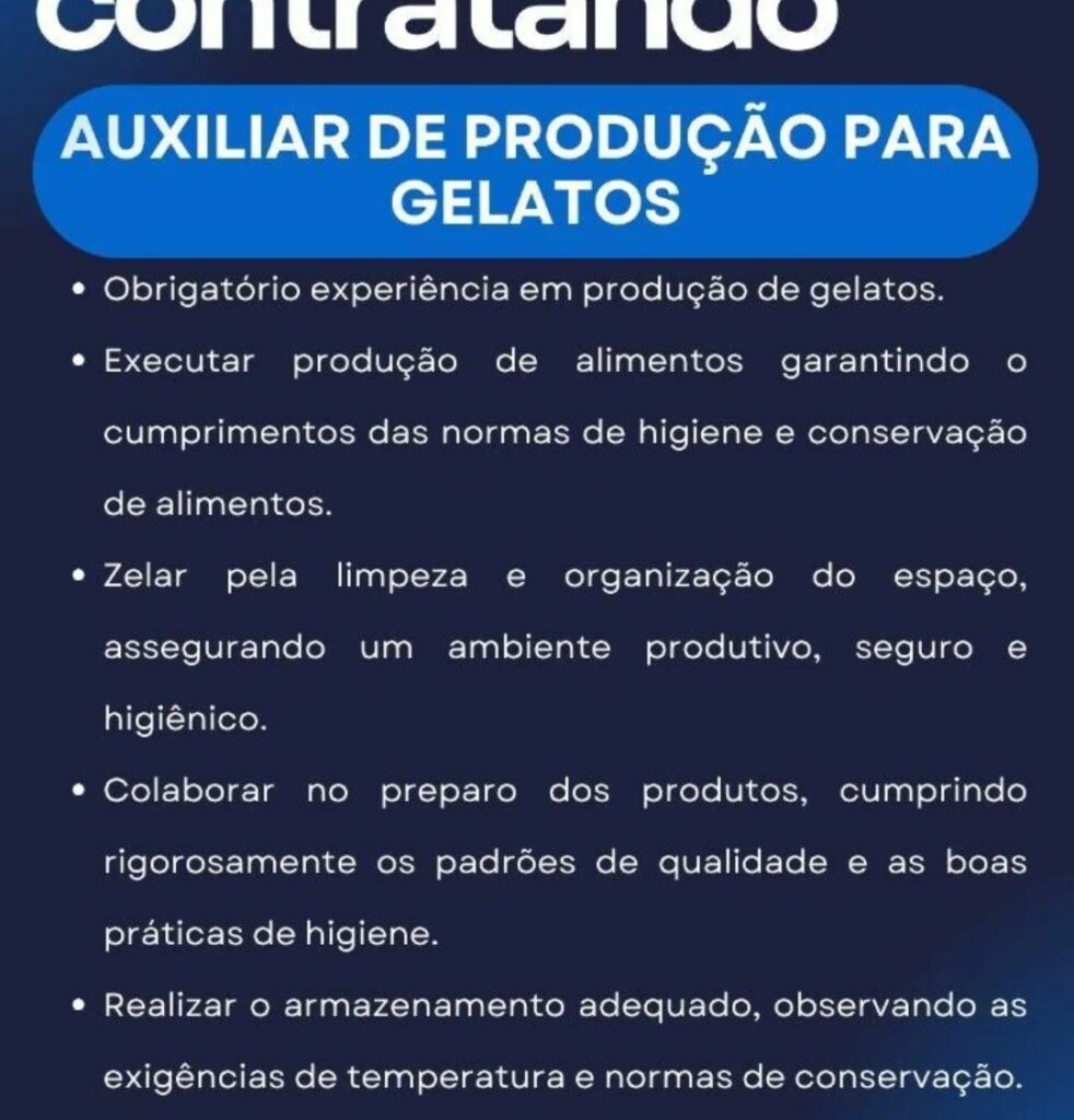 Empresa está selecionando Auxiliar de produção para gelatos; Envie seu currículo!