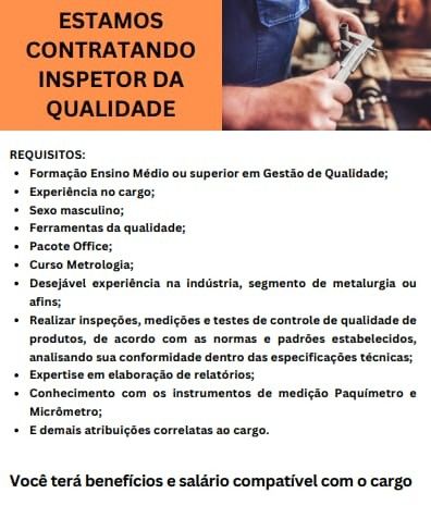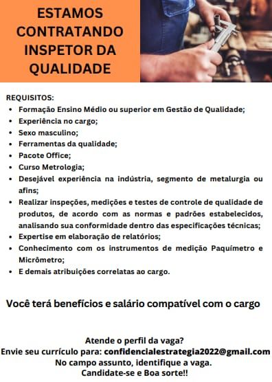Empresa está selecionando Inspetor da qualidade; Envie seu currículo!
