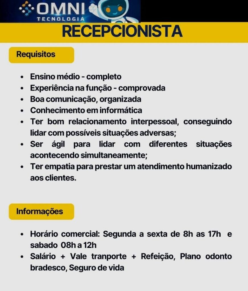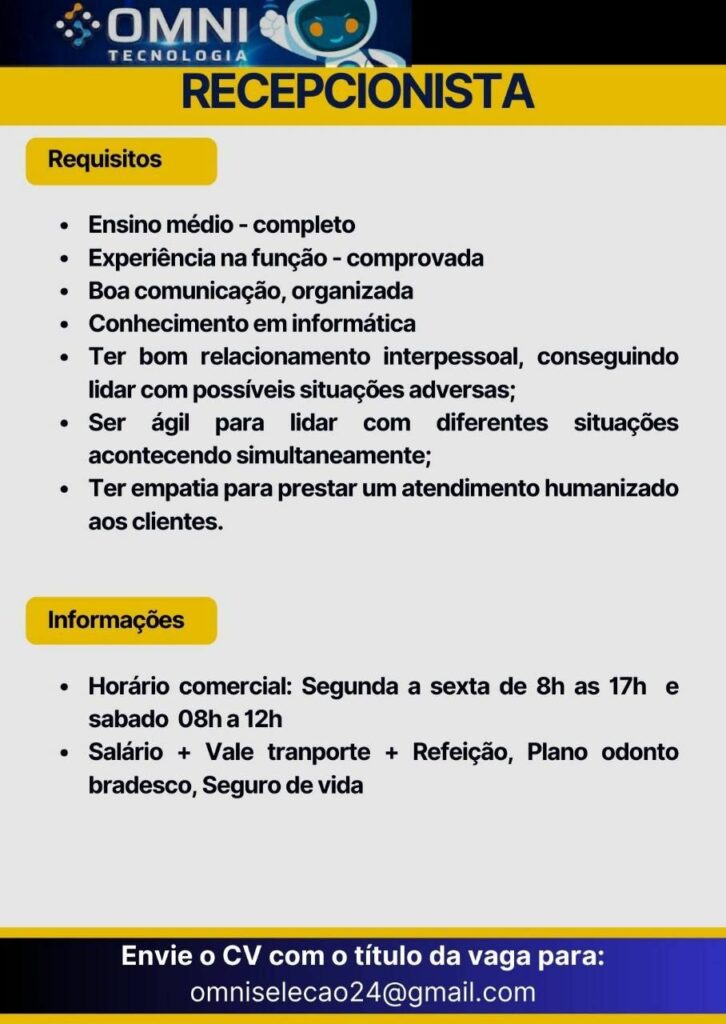 Empresa está selecionando Recepcionista; Envie seu currículo!
