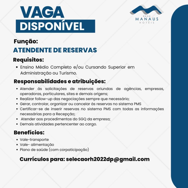 Empresa seleciona Atendente de reservas; Envie seu currículo!