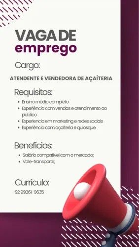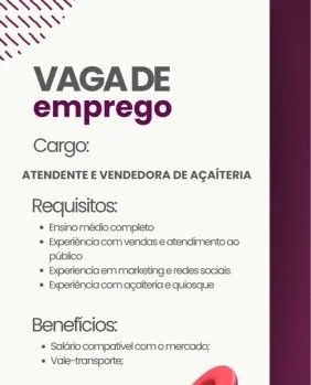 Empresa seleciona Atendente e vendedora de açaíteria; Envie seu currículo!