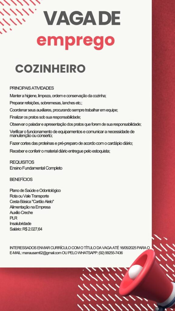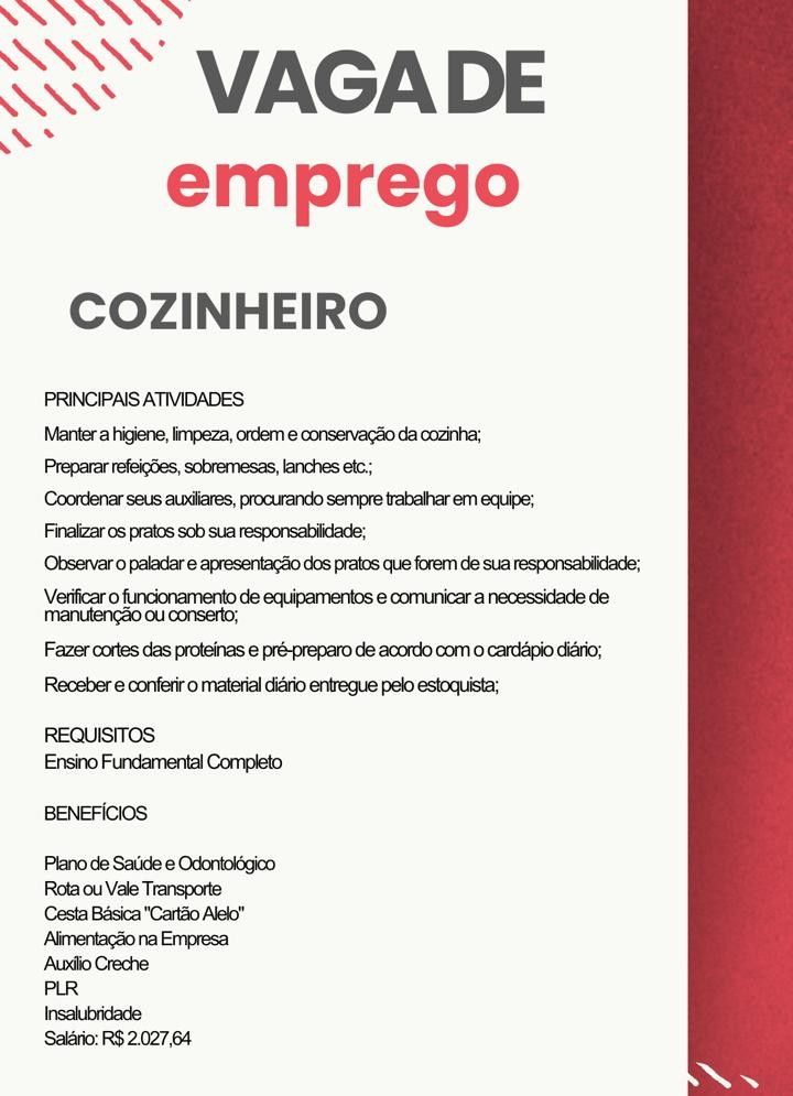 Empresa seleciona para vaga de Cozinheiro; Envie seu currículo!