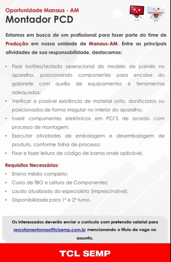 Empresa TCL Semp abre seleção para Montador; Envie seu currículo!