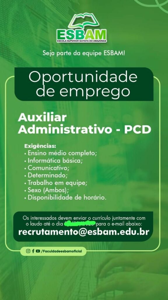 Faculdade Esbam seleciona Auxiliar administrativo; Envie seu currículo!