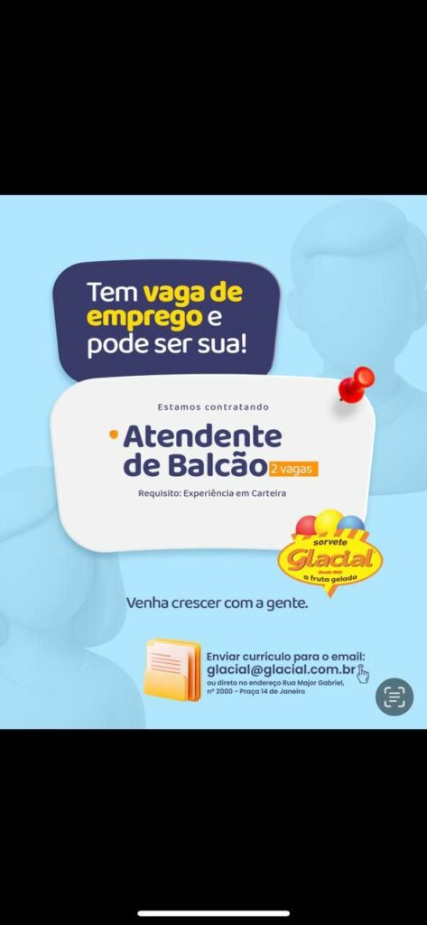 Glacial está selecionando Atendente de balcão; Envie seu currículo!