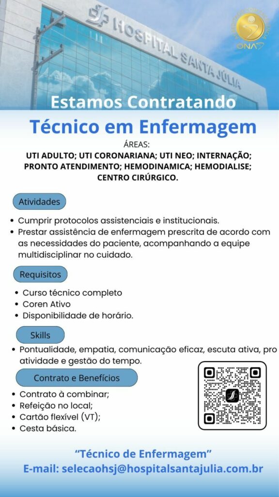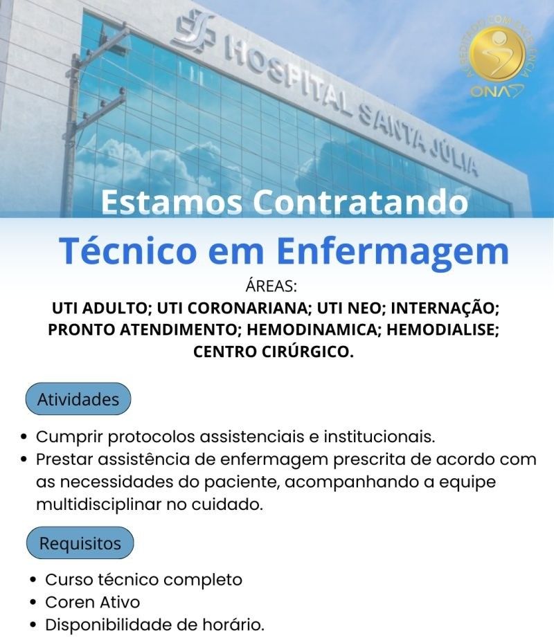 Hospital Santa Júlia está selecionando Técnico em enfermagem; Envie seu currículo!