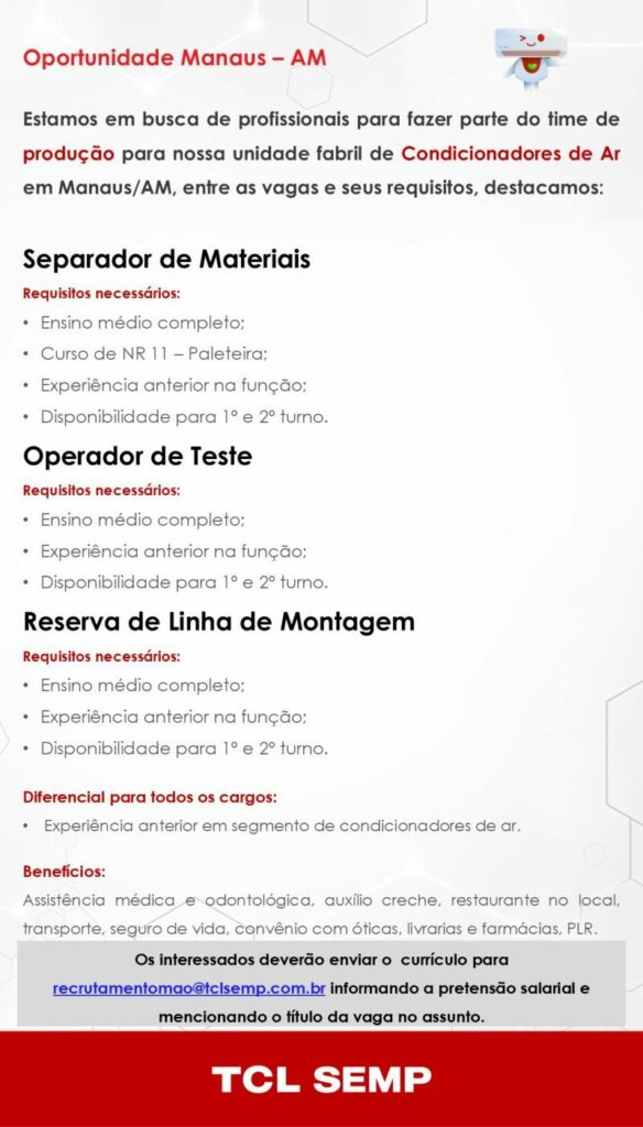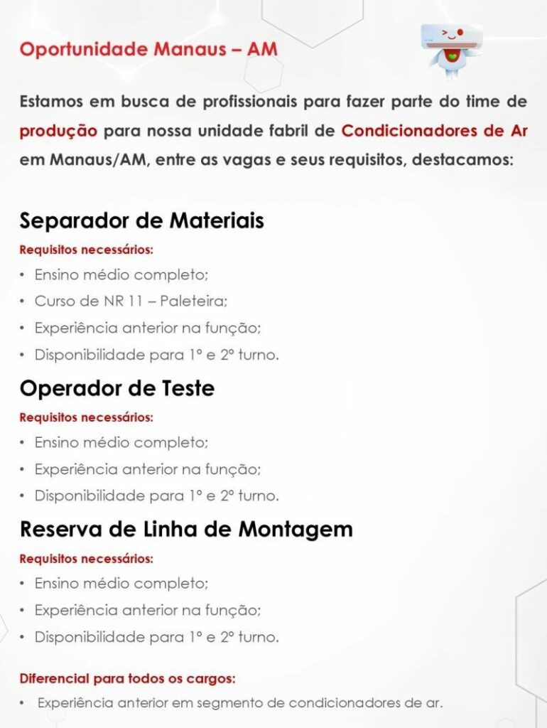 Indústria de grande porte contrata Reserva de Linha de Montagem, Operador de Teste, Separador de Materiais; Envie seu currículo!