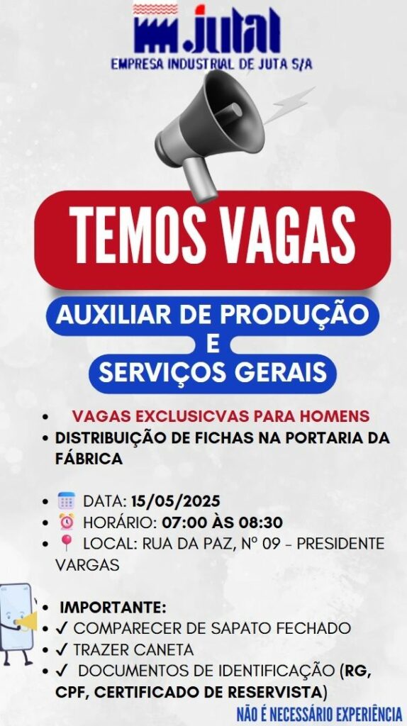 Não é necessário experiência! Empresa industrial Jutal seleciona Auxiliar de produção, Serviços Gerais; Envie seu currículo!