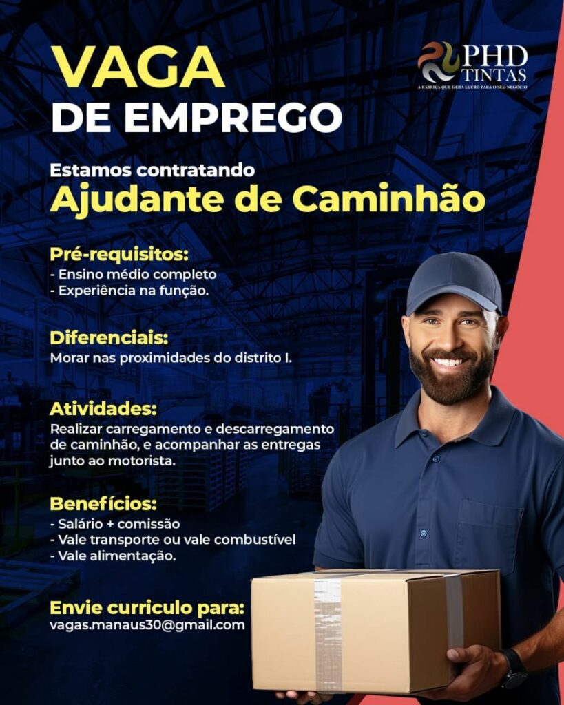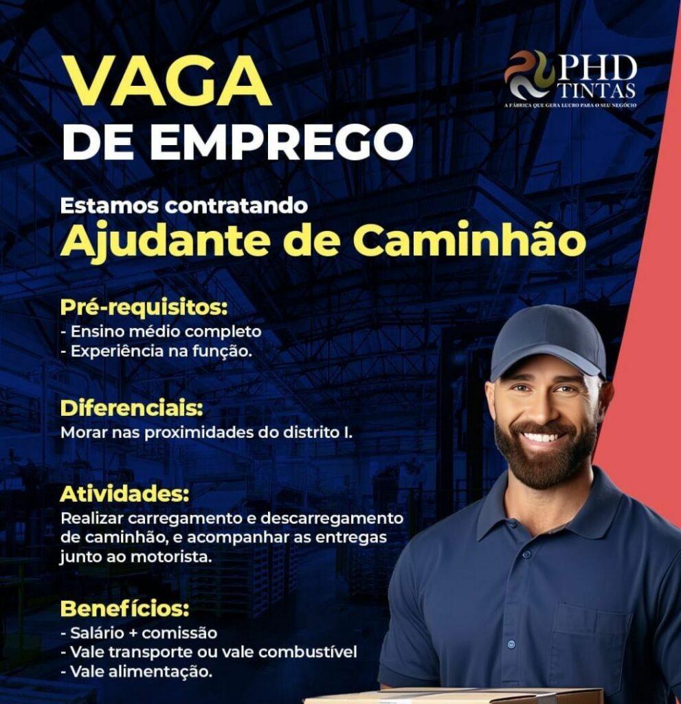 PHD Tintas seleciona Ajudante de caminhão; Envie seu currículo!
