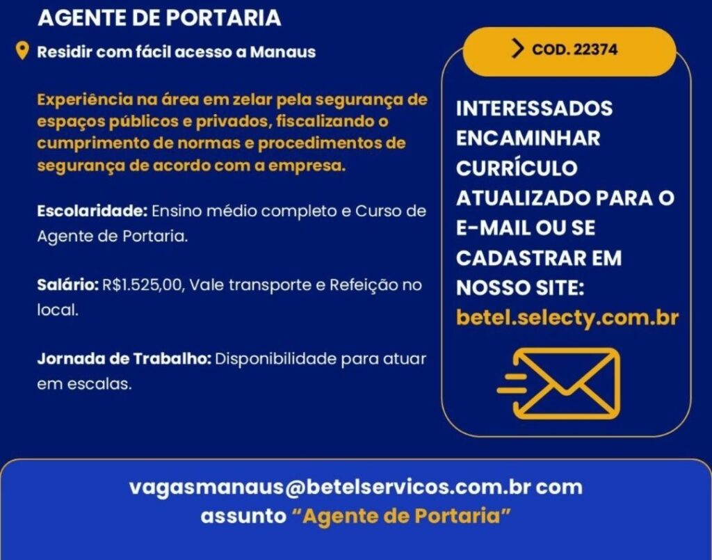 Rh está selecionando Agente de portaria; Envie seu currículo!