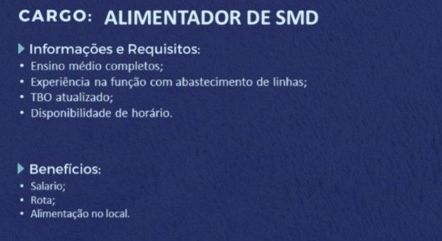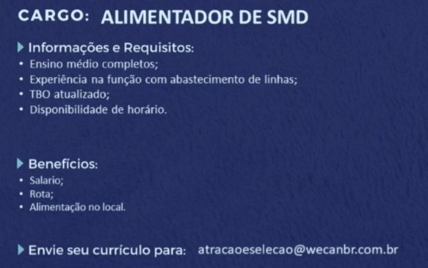 Rh está selecionando Alimentador de smd; Envie seu currículo!