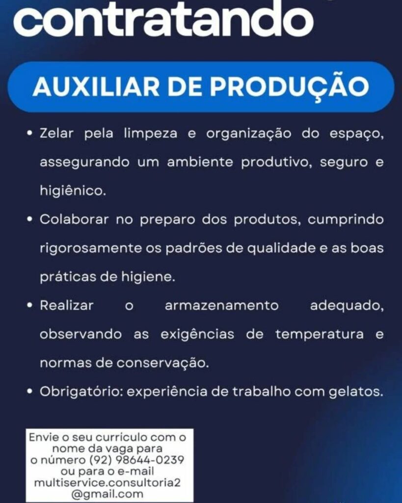 Rh está selecionando Auxiliar de produção; Envie seu currículo!