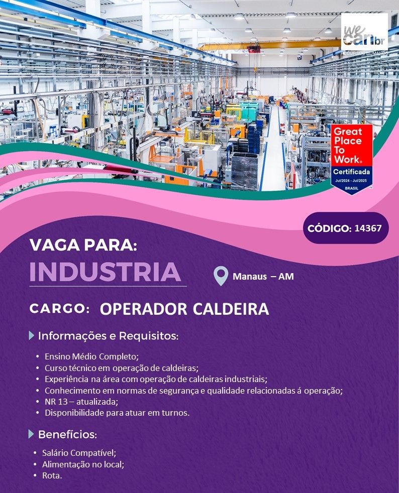 Rh está selecionando Operador de caldeira; Envie seu currículo!