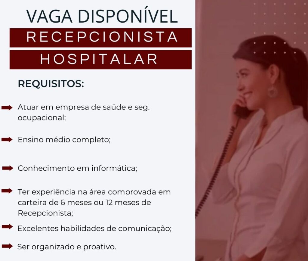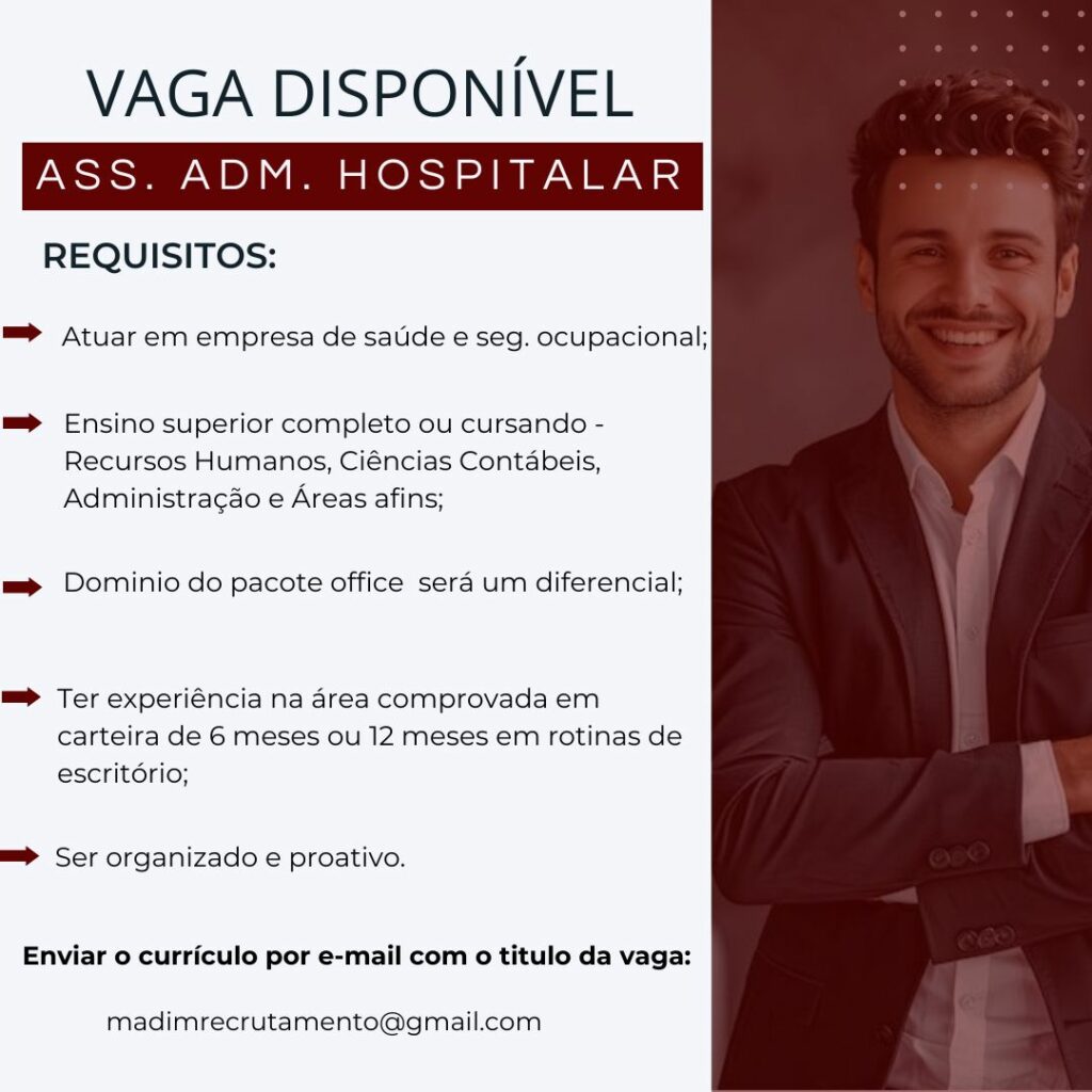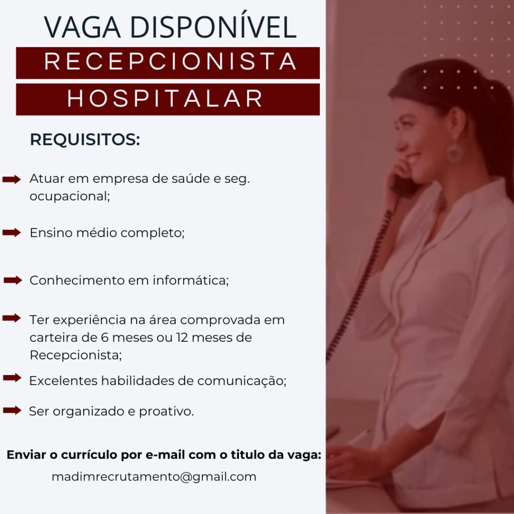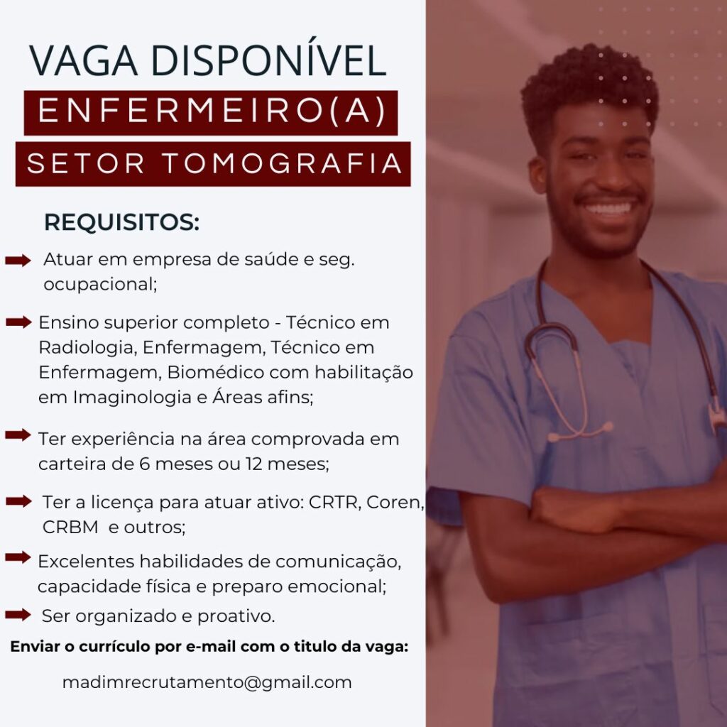 Seleção para seguintes vagas Auxiliar de departamento pessoal, Assistente adm hospitalar, Enfermeiro (a) setor tomografia, Maqueiro, Recepcionista hospitalar; Envie seu currículo!