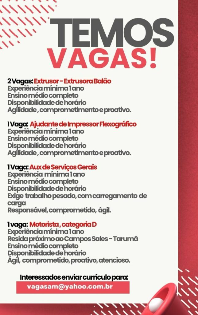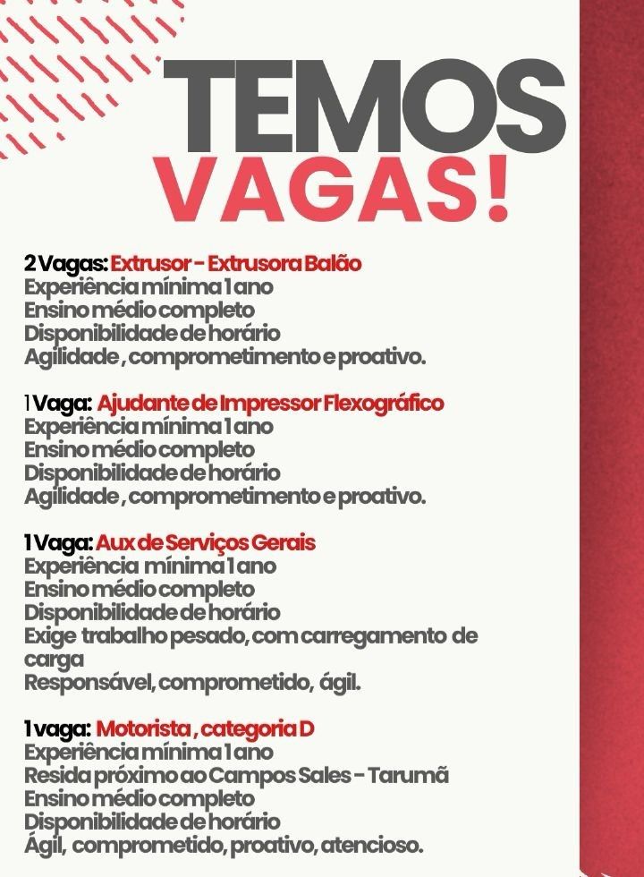 Seleção para seguintes vagas Estrusor – extrusora balão, Ajudante de Impressor flexográfico, Auxiliar de serviços gerais, Motorista; Envie seu currículo!