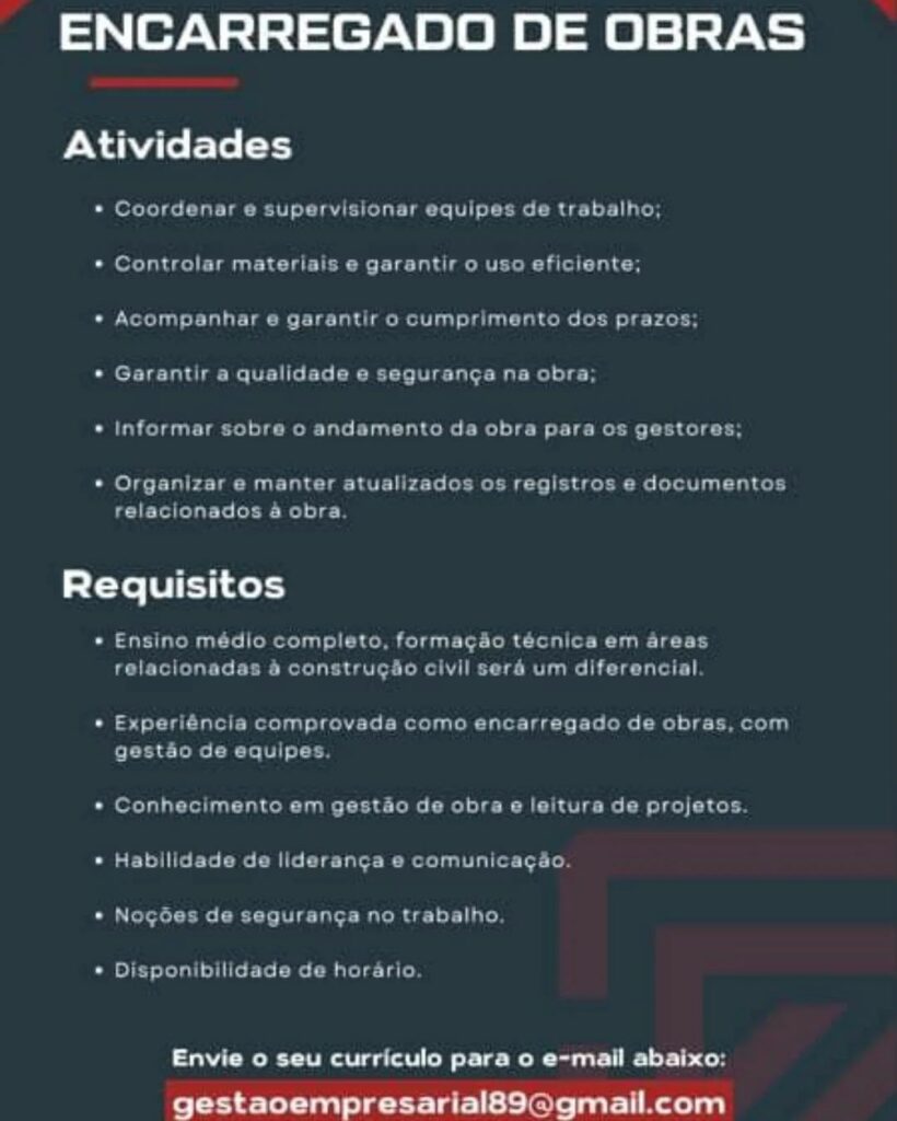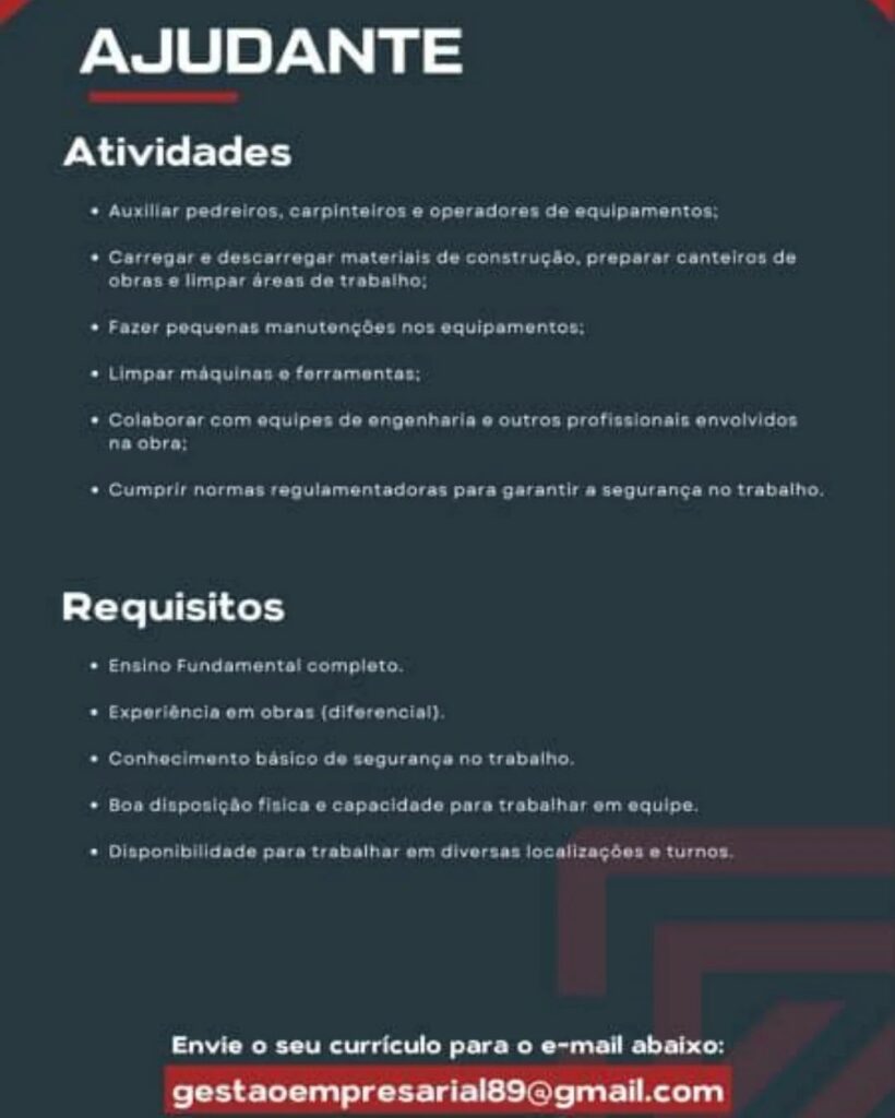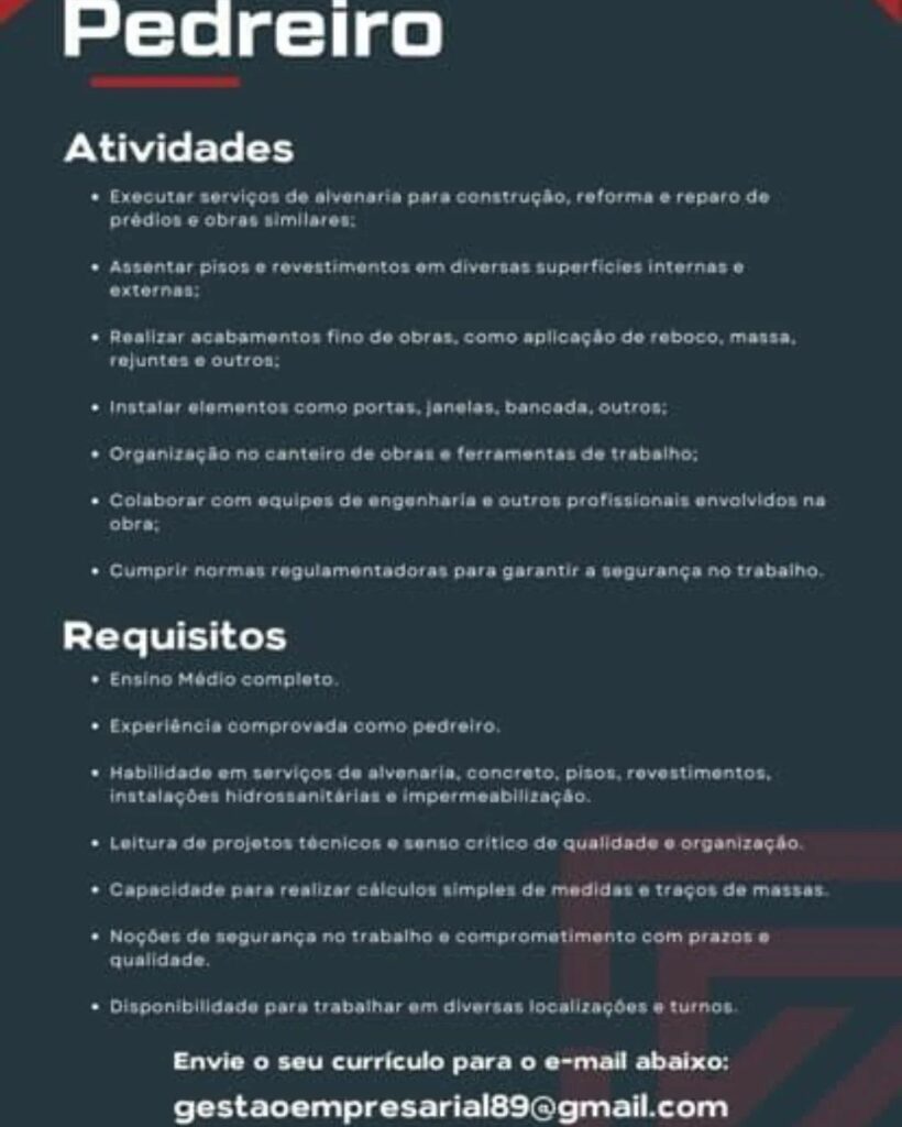 Seleção para seguintes vagas Pedreiro, Encarregado de Obras, Ajudante; Envie seu currículo!