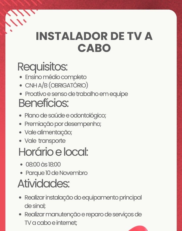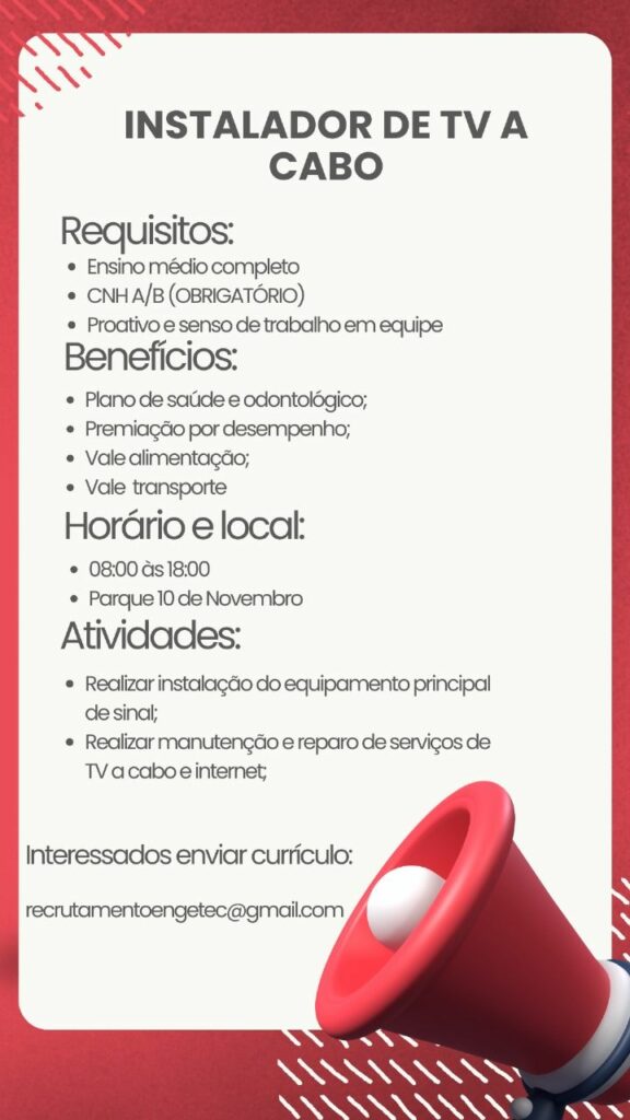 Seleção para vaga de Instalador de tv a cabo; Envie seu currículo!