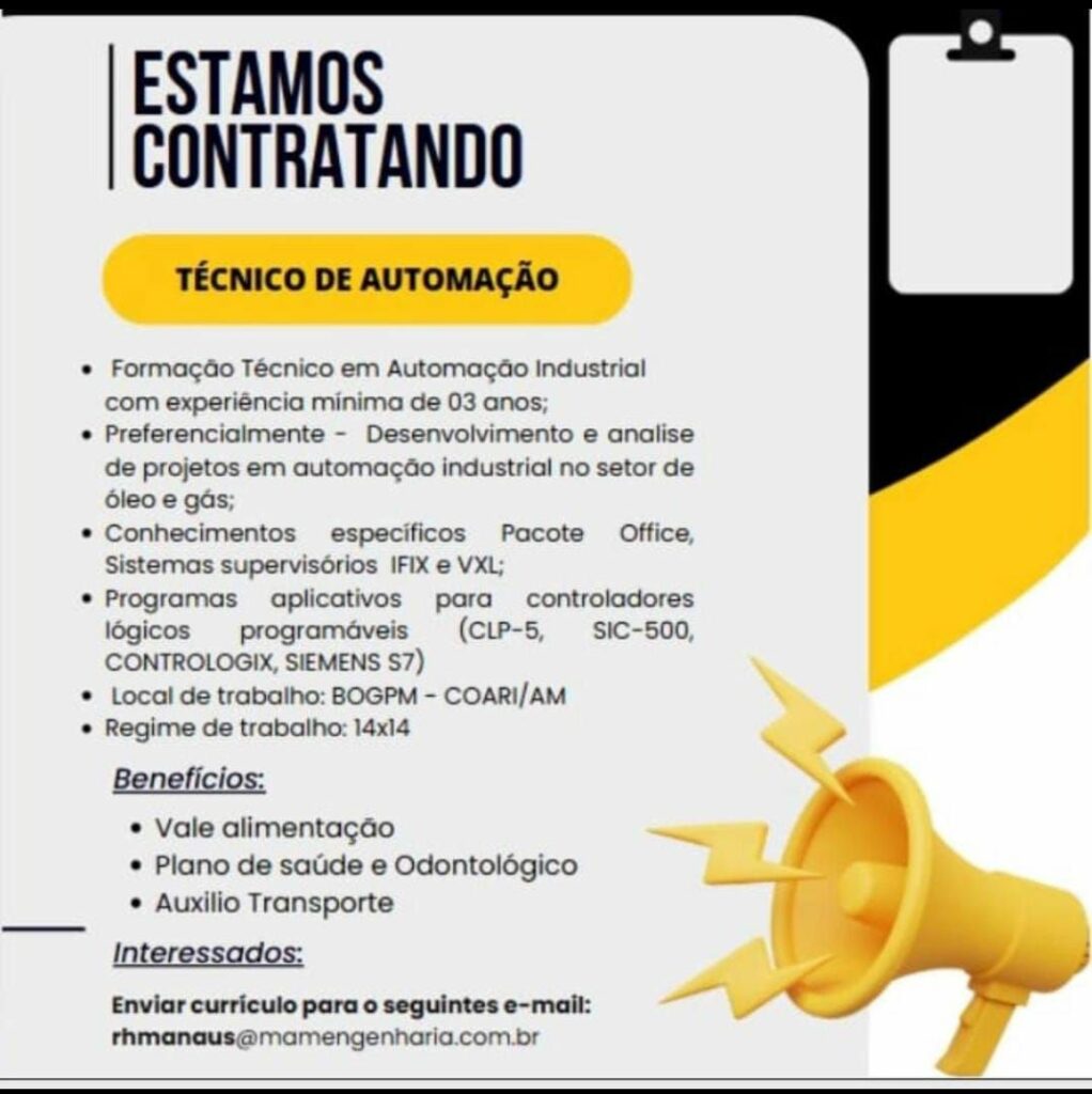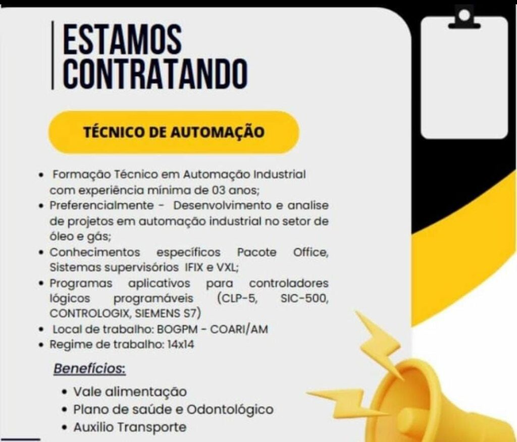 Seleção para vaga de Técnico de automação; Envie seu currículo!