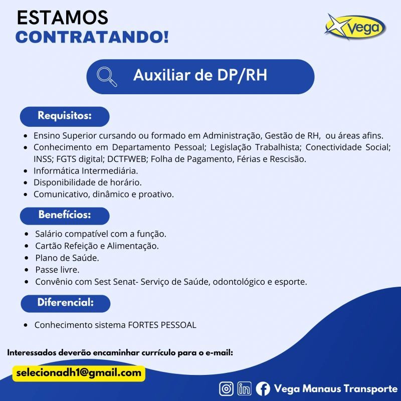 Vega Transportes seleciona Auxiliar de dp / rh; Envie seu currículo!
