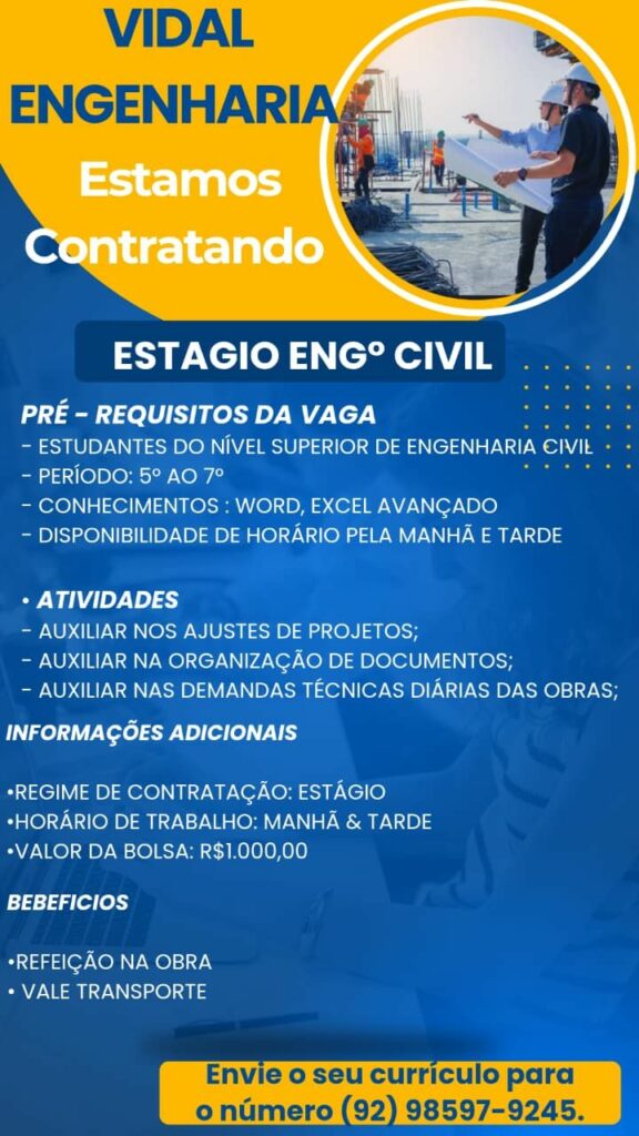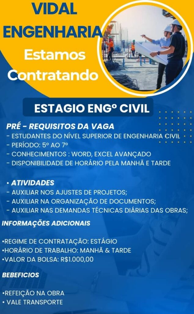 Vidal engenharia seleciona Estágio Engenharia civil; Envie seu currículo!
