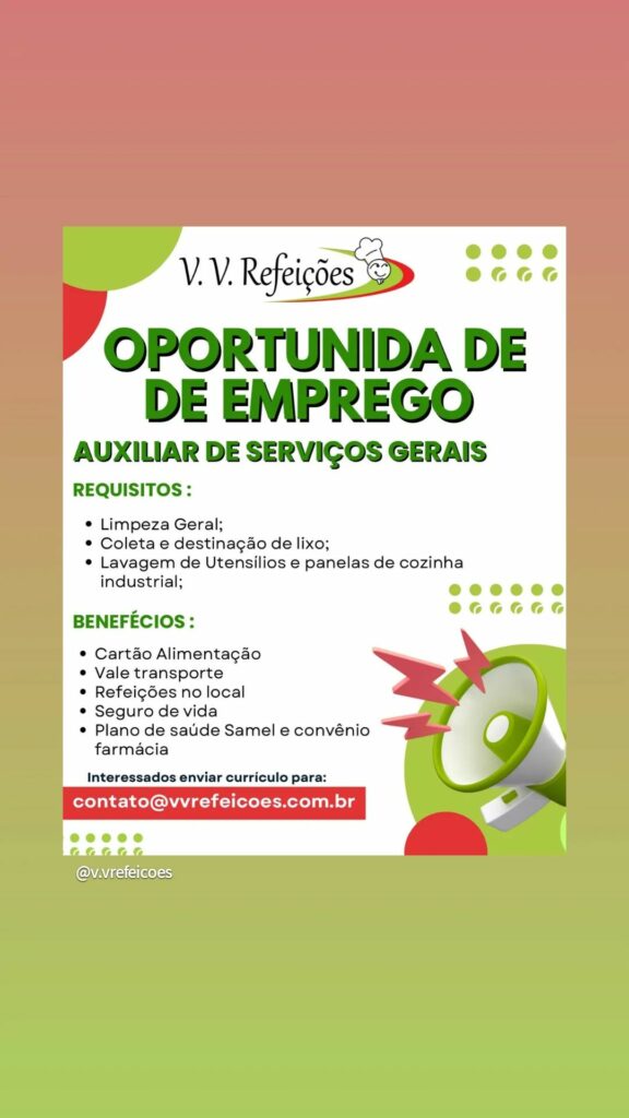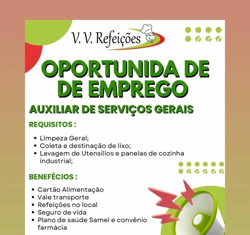 VV refeições seleciona Auxiliar de serviços gerais; Envie seu currículo!