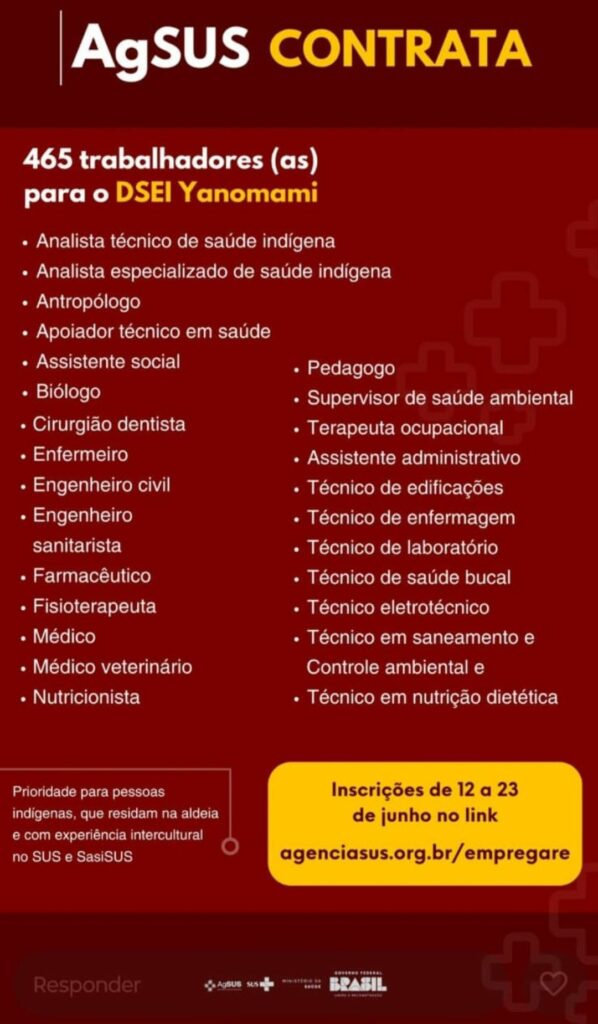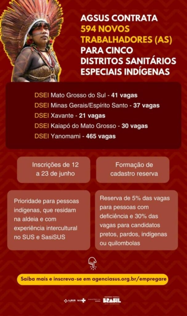 Agsus abre seleção para 594 Trabalhadores (AS) para cinco distritos sanitários especiais indígenas