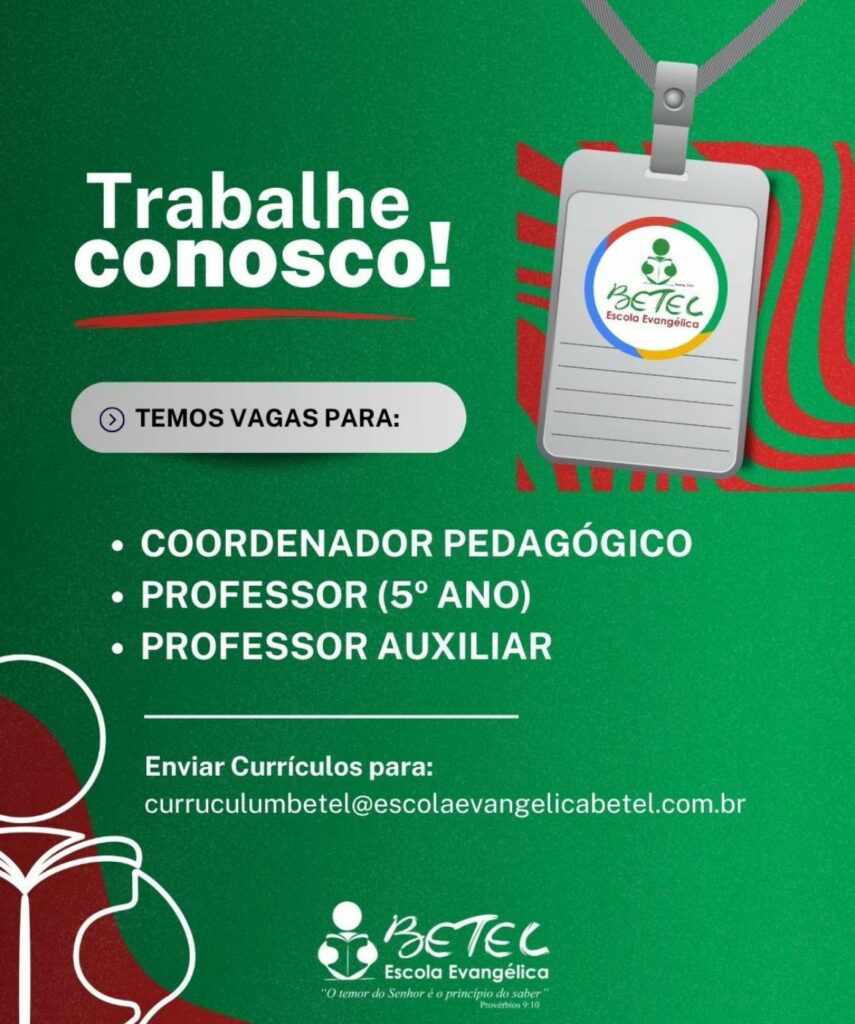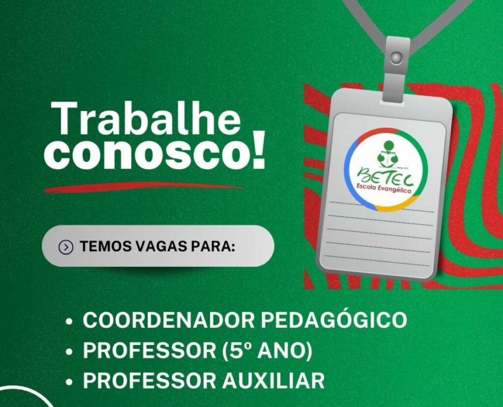 Betel escola evangélica seleciona Coordenador pedagógico, Professor 5° ano, Professor Auxiliar; Envie seu currículo!