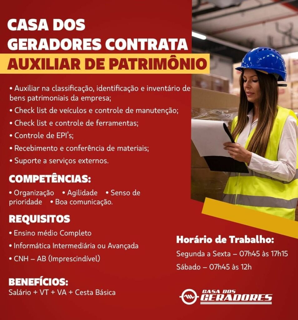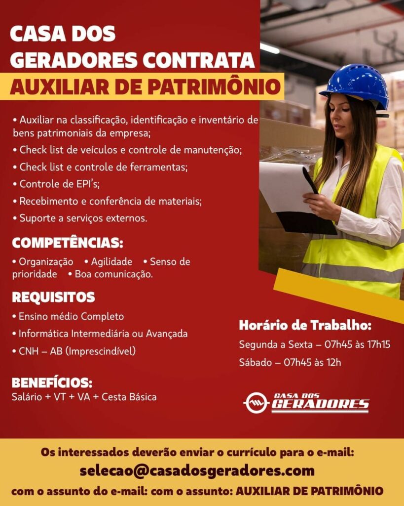 Casa dos geradores seleciona Auxiliar de patrimônio; Envie seu currículo!