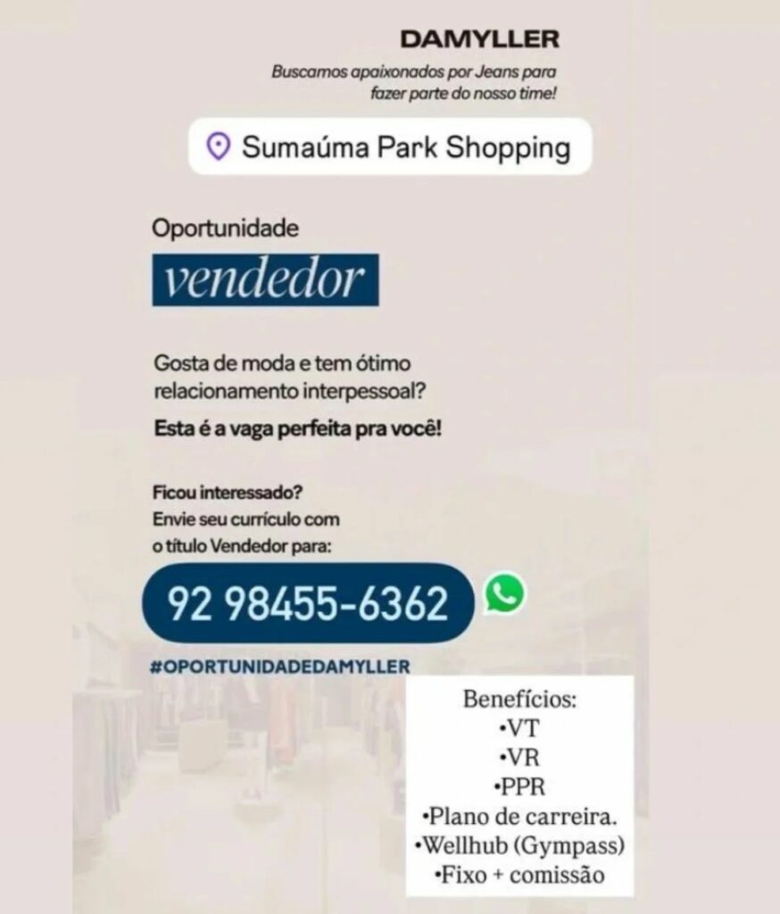Damyller Samaúma parke shopping seleciona Vendedor; Envie seu currículo!