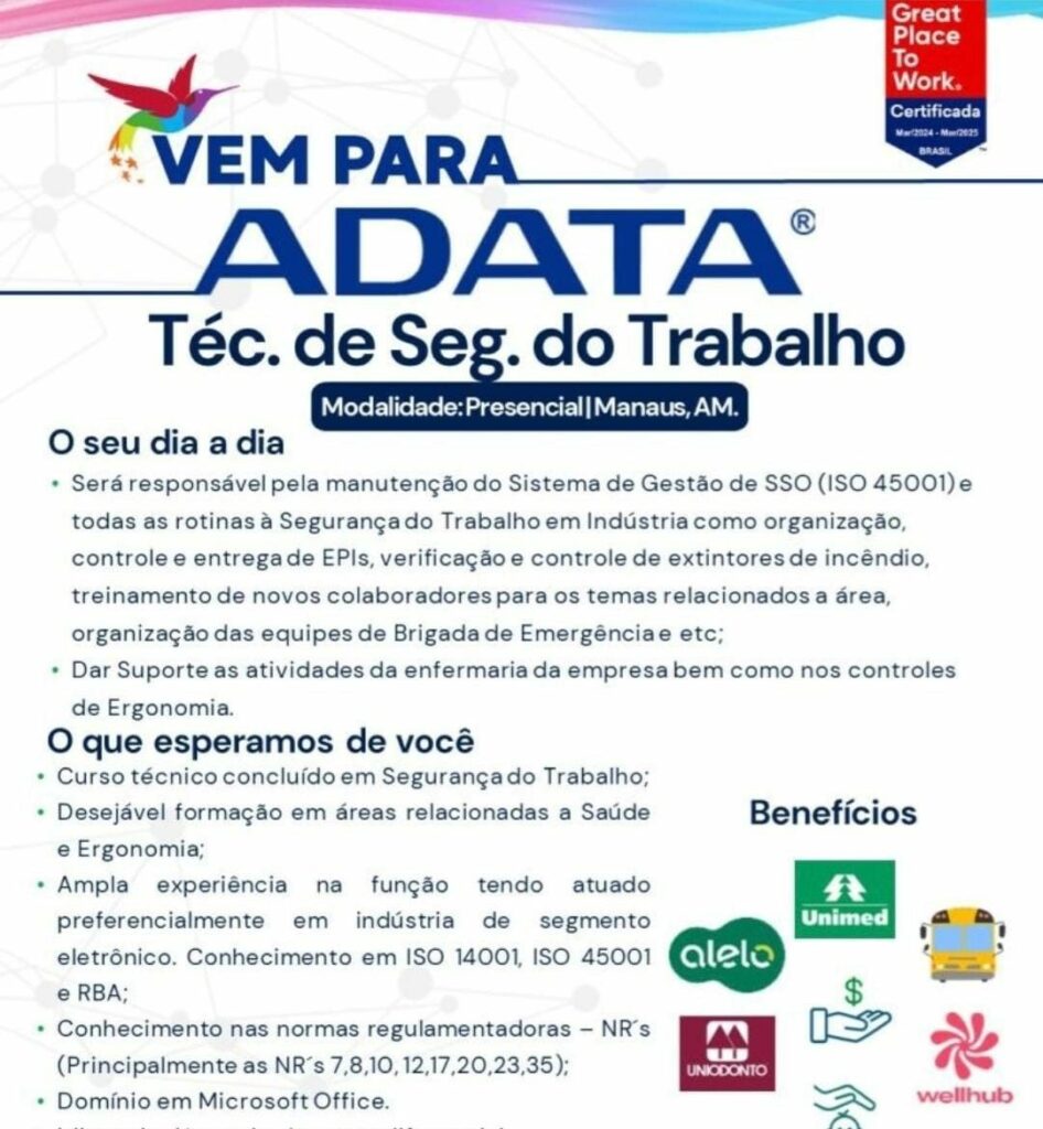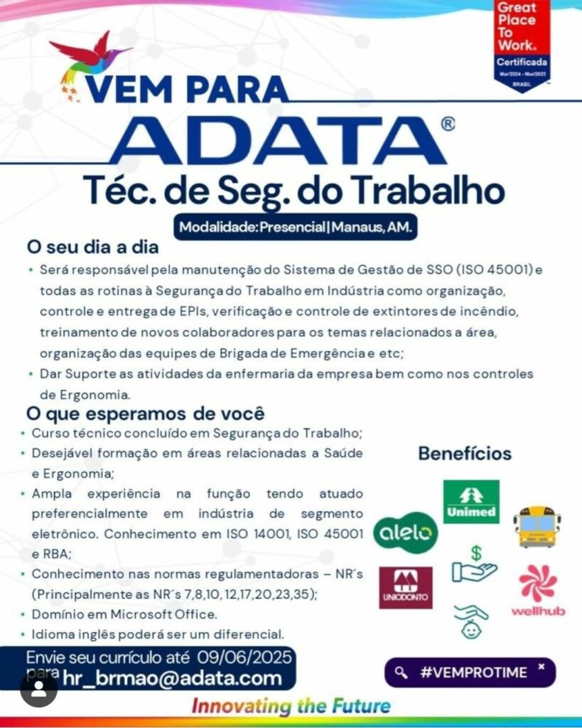 Empresa Adata está selecionando Técnico de segurança do trabalho; Envie seu currículo!