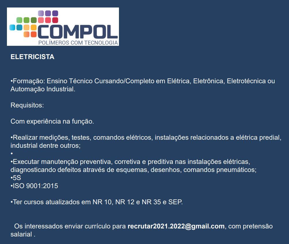 Empresa Compol está selecionando Eletricista; Envie seu currículo!