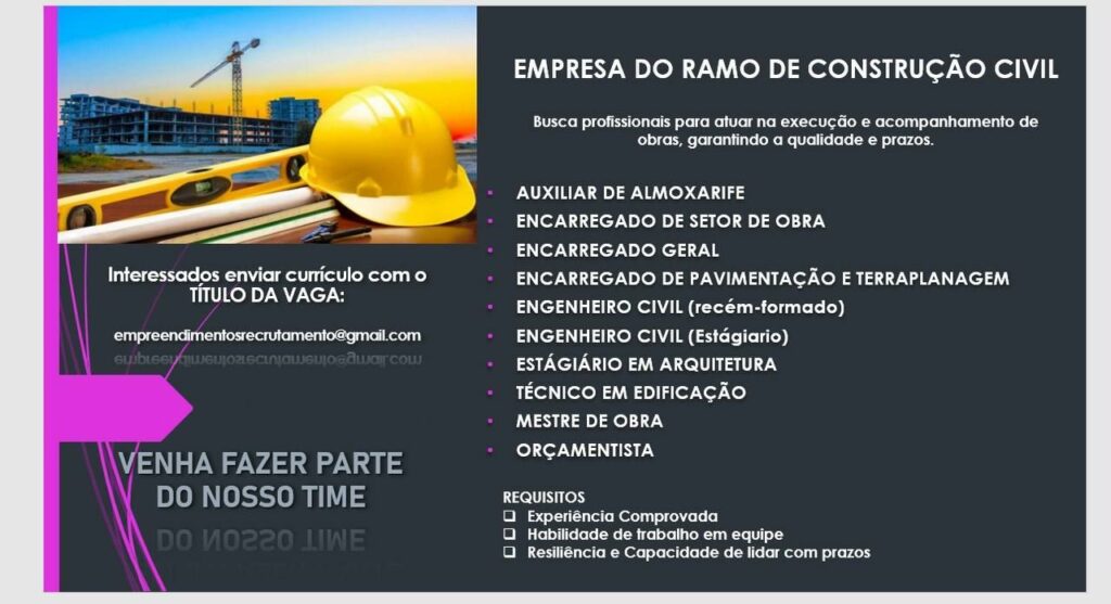 Empresa do ramo de construção civil abre vagas de emprego; Saiba como se candidatar!
