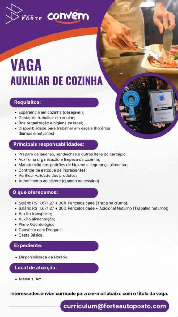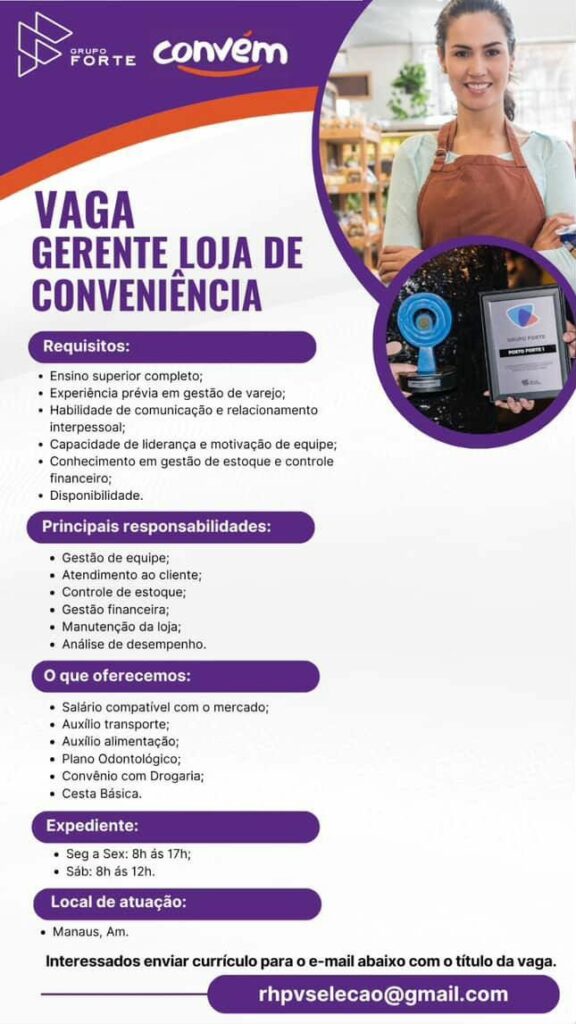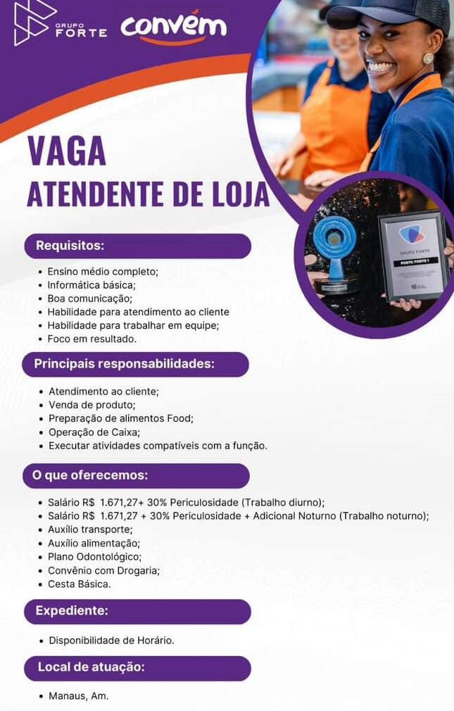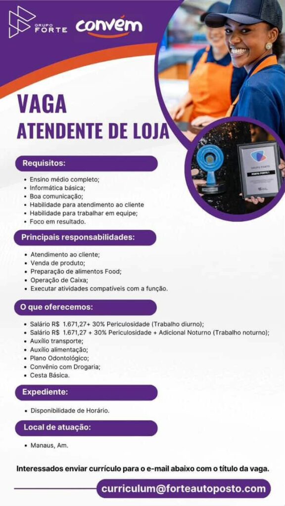 Empresa está selecionando Atendente de loja, Auxiliar de cozinha, Frentista, Gerente loja de conveniência,