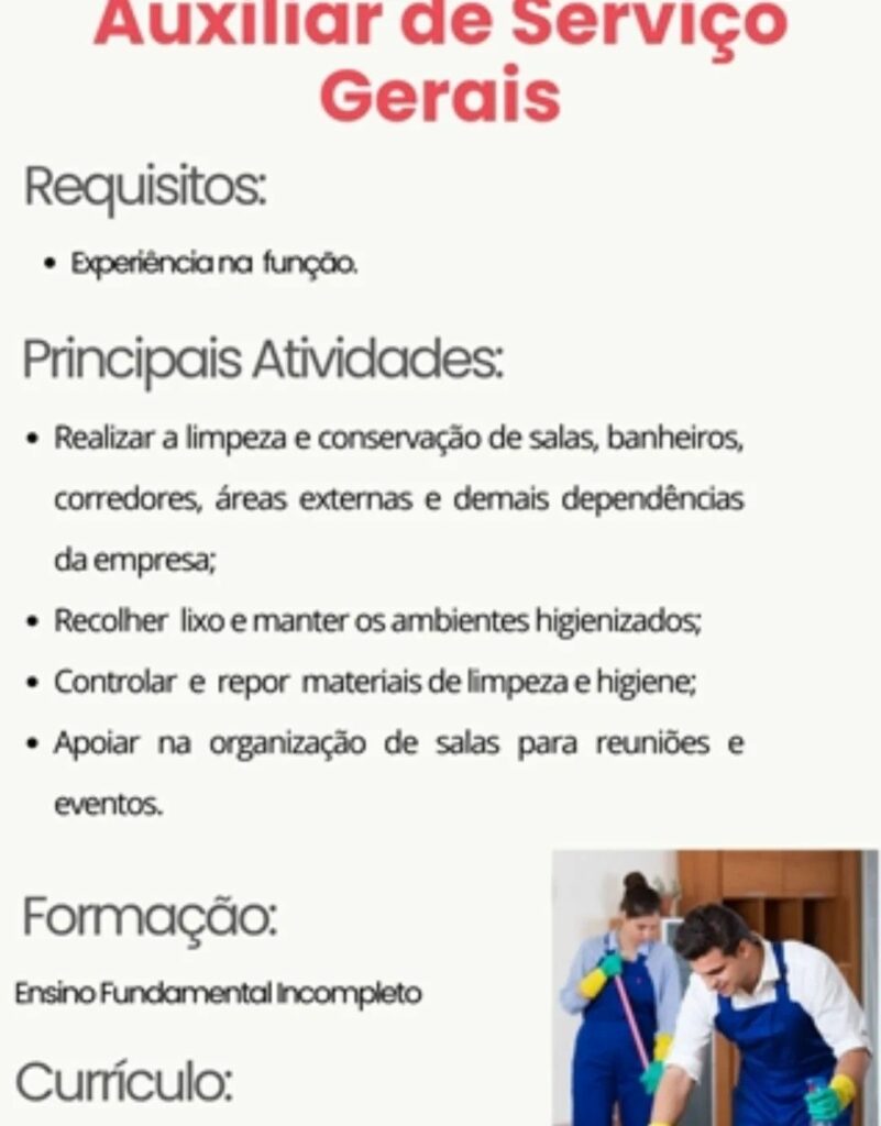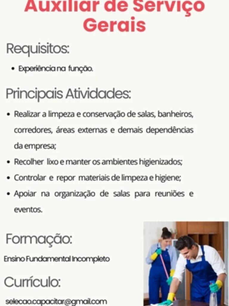 Empresa está selecionando Auxiliar de serviços gerais; Envie seu currículo!