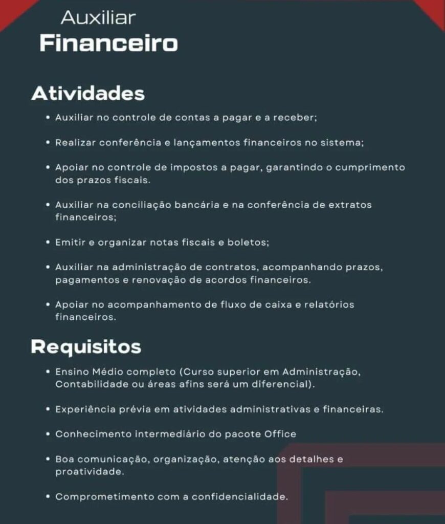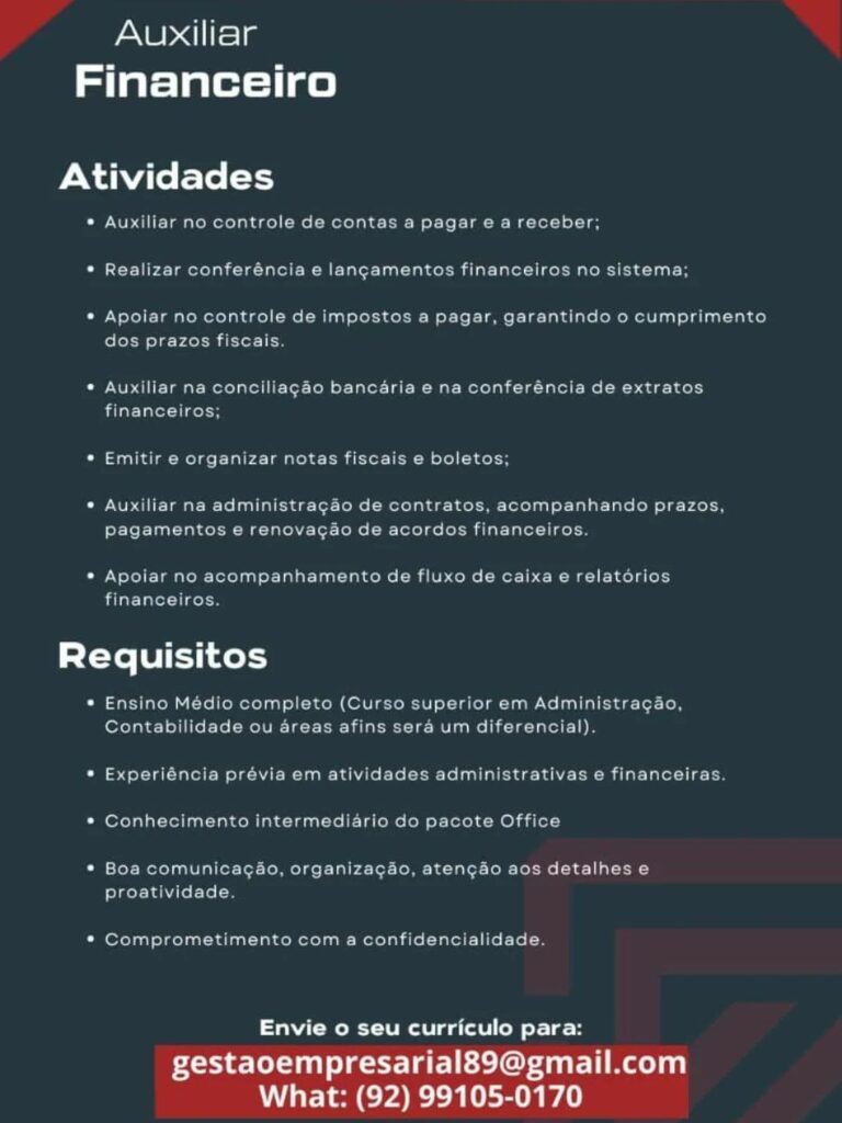 Empresa está selecionando Auxiliar financeiro; Envie seu currículo!