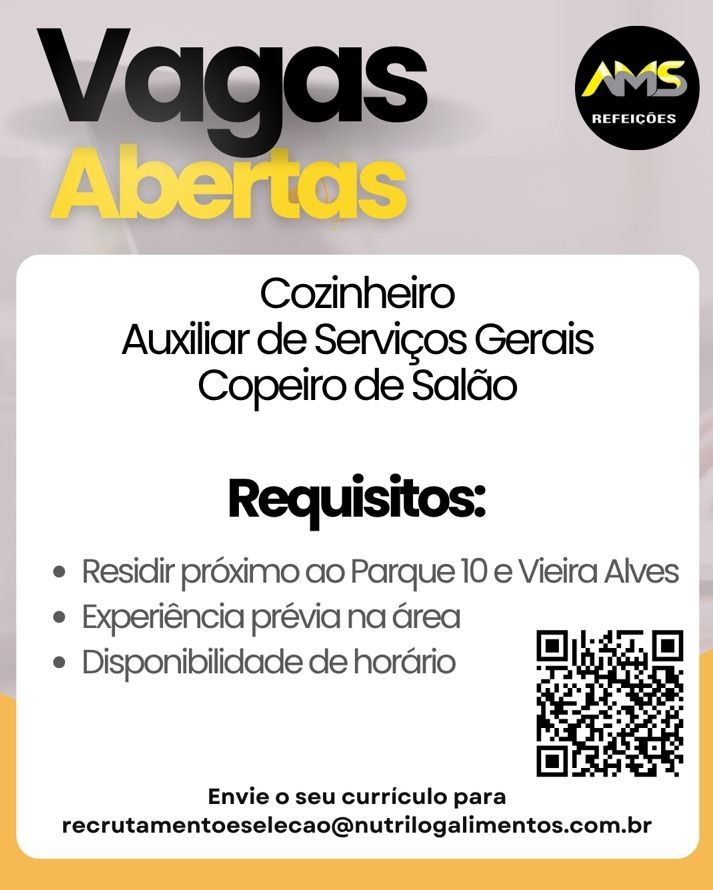 Empresa está selecionando Cozinheiro, Auxiliar de serviços gerais, Copeiro de salão; Envie seu currículo!