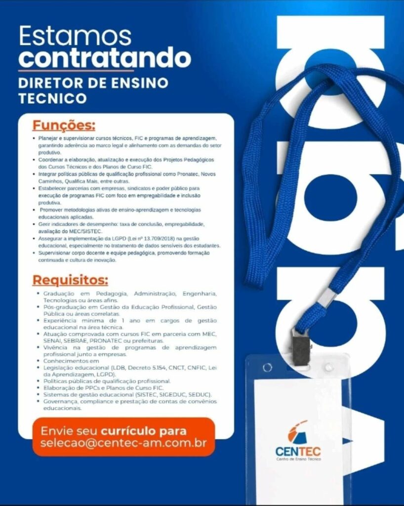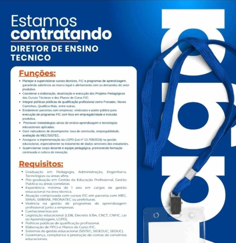 Empresa está selecionando Diretor de ensino técnico; Envie seu currículo!
