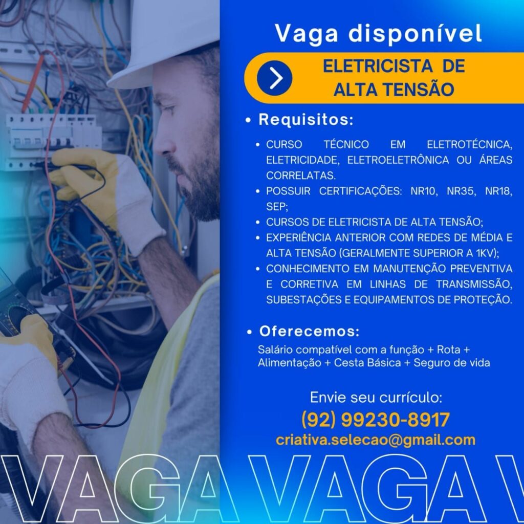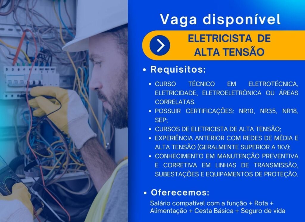 Empresa está selecionando Eletricista de auta tensão; Envie seu currículo!