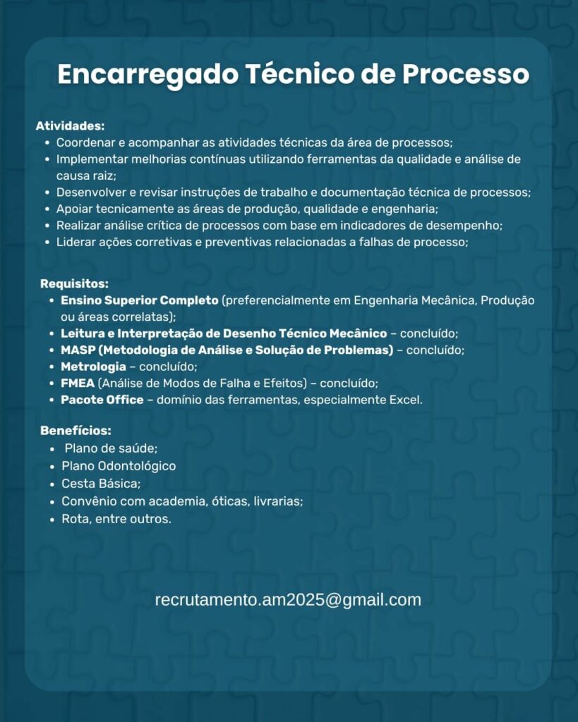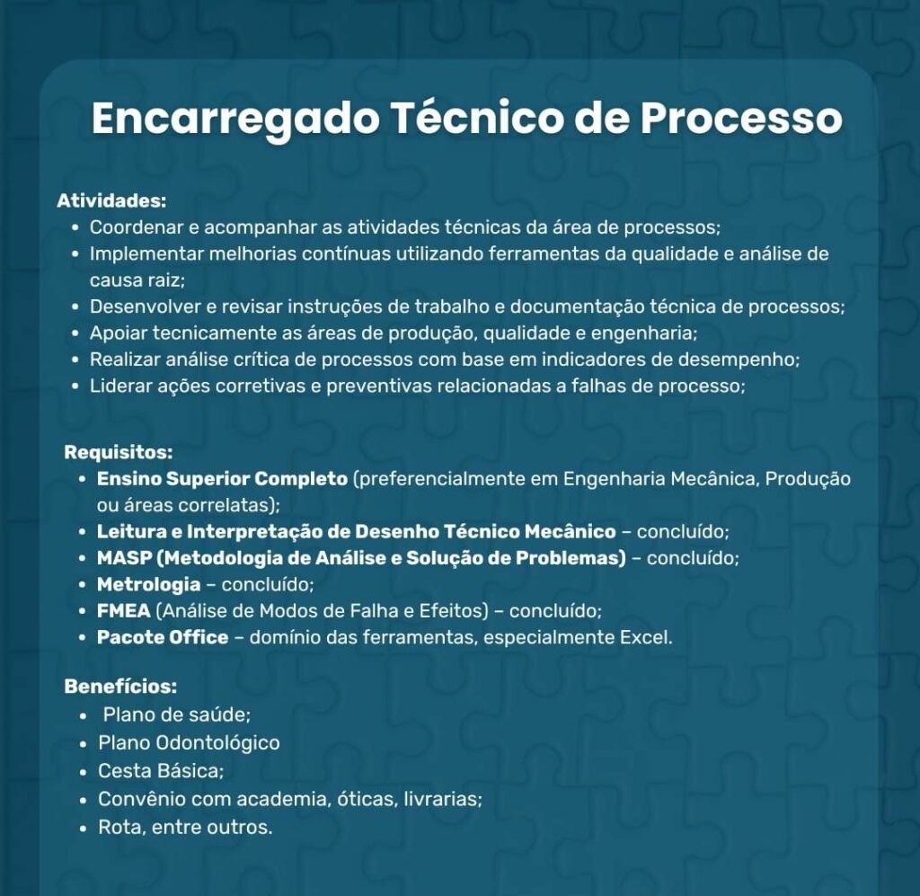 Empresa está selecionando Encarregado técnico de processo; Envie seu currículo!