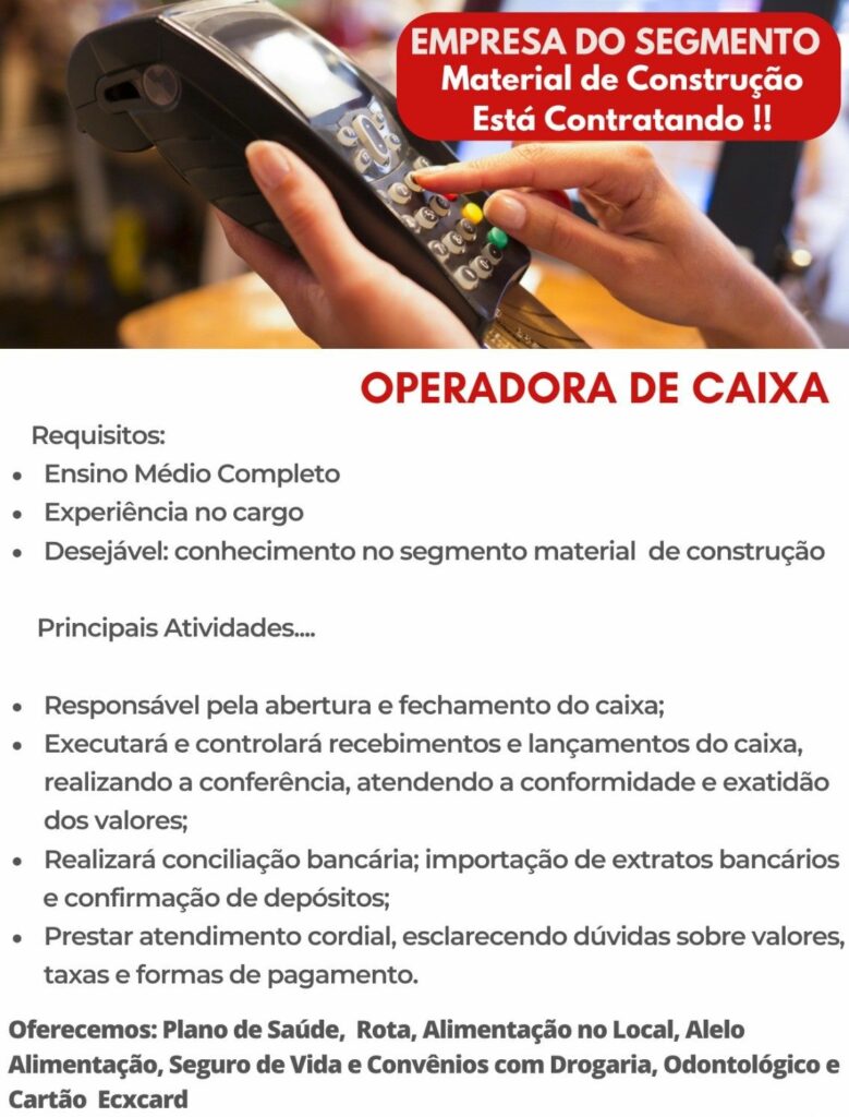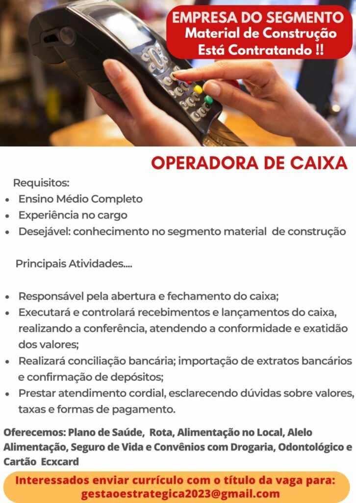Empresa está selecionando Operadora de caixa; Envie seu currículo!