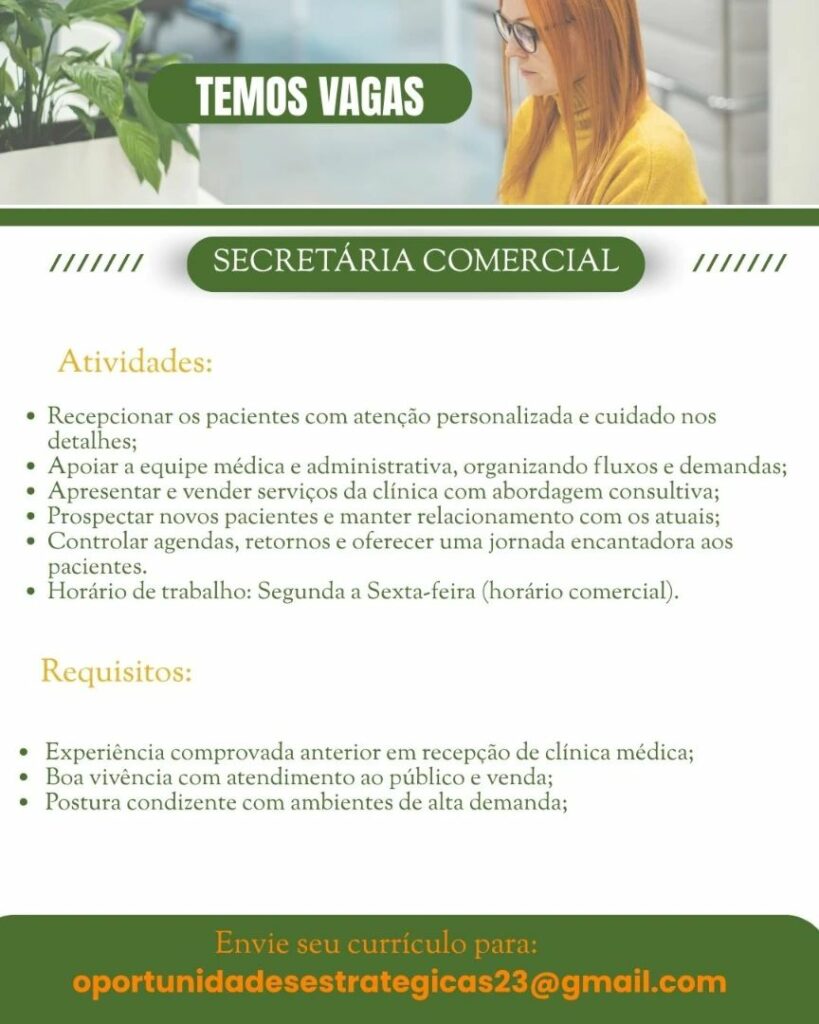 Empresa está selecionando Secretária comercial; Envie seu currículo!