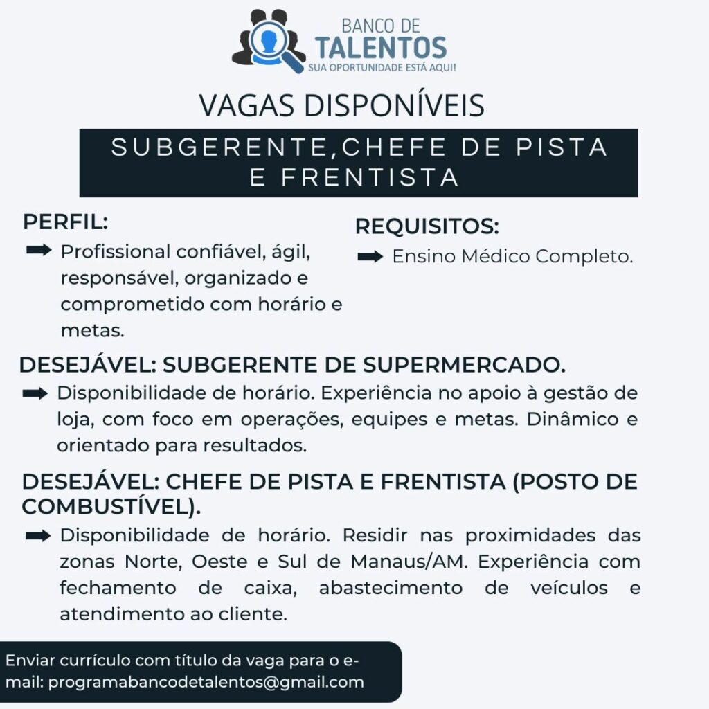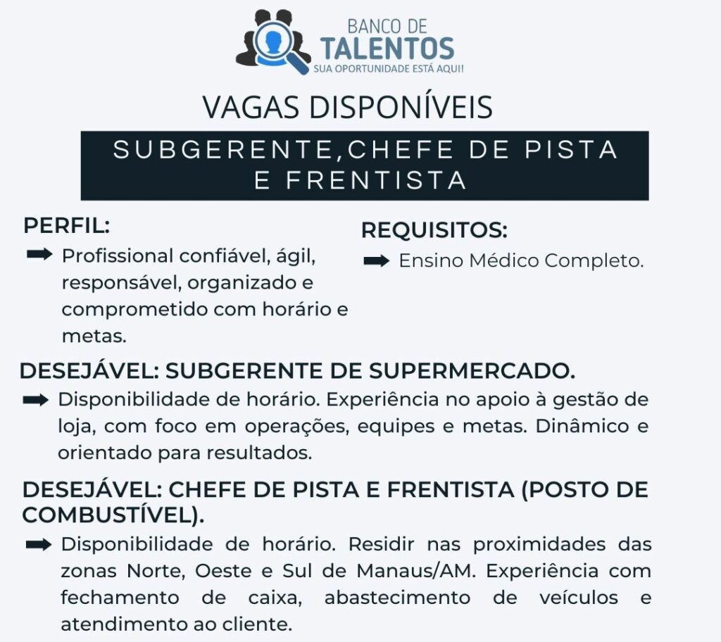 Empresa está selecionando Subgerente, Chefe de pista, Frentista; Envie seu currículo!