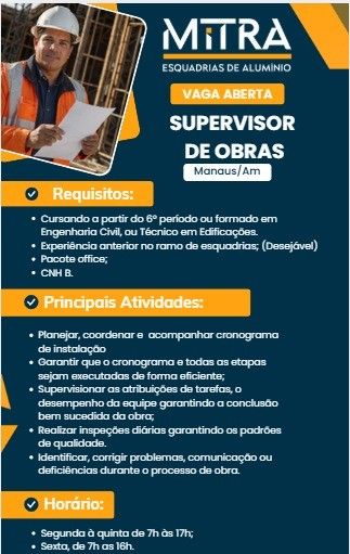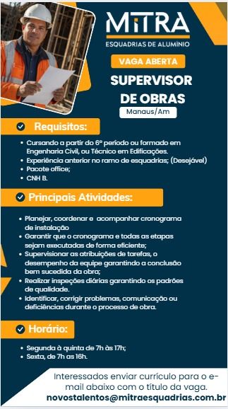 Empresa está selecionando Supervisor de obras; Envie seu currículo!