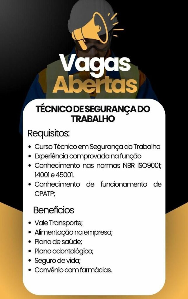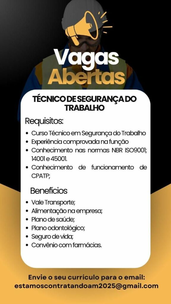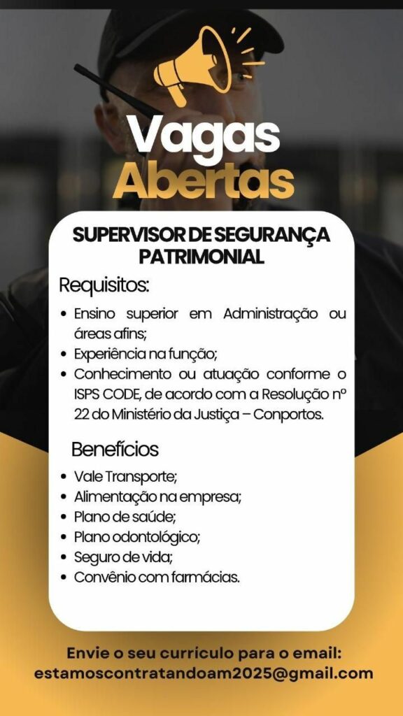 Empresa está selecionando Supervisor de segurança patrimonial, Técnico de segurança do trabalho; Envie seu currículo!