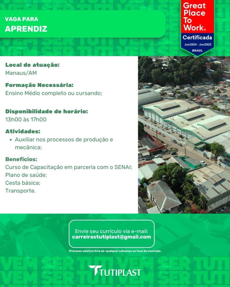 Empresa Tutiplast está selecionando Aprendiz; Envie seu currículo!