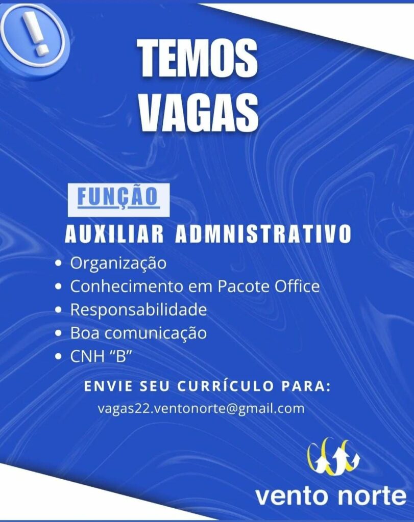 Empresa Vento do norte seleciona Auxiliar administrativo; Envie seu currículo!