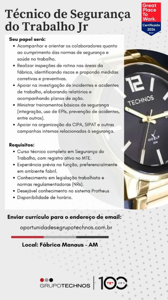 Fábrica da Technos seleciona Montador e para mais quatro cargos; Envie seu currículo!