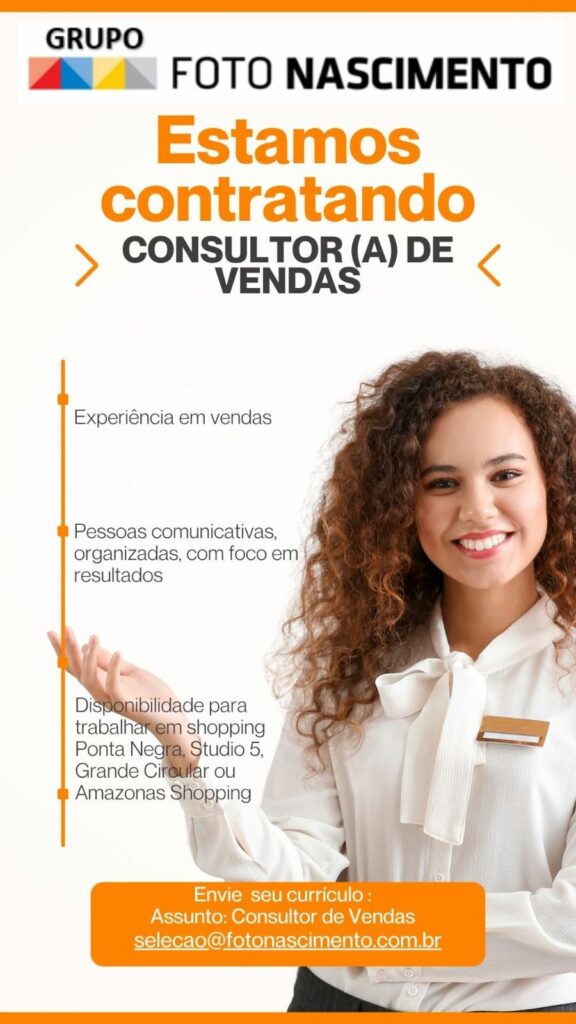 Grupo foto Nascimento seleciona Consultor (a) de vendas; Envie seu currículo!