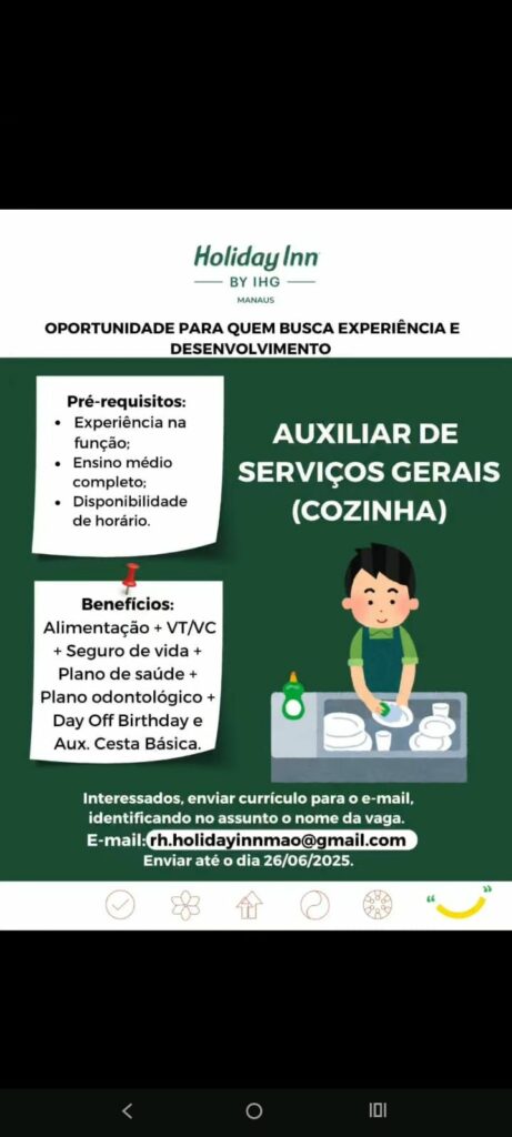 Holiday Inn Hotel seleciona Auxiliar de serviços gerais cozinha; Envie seu currículo!